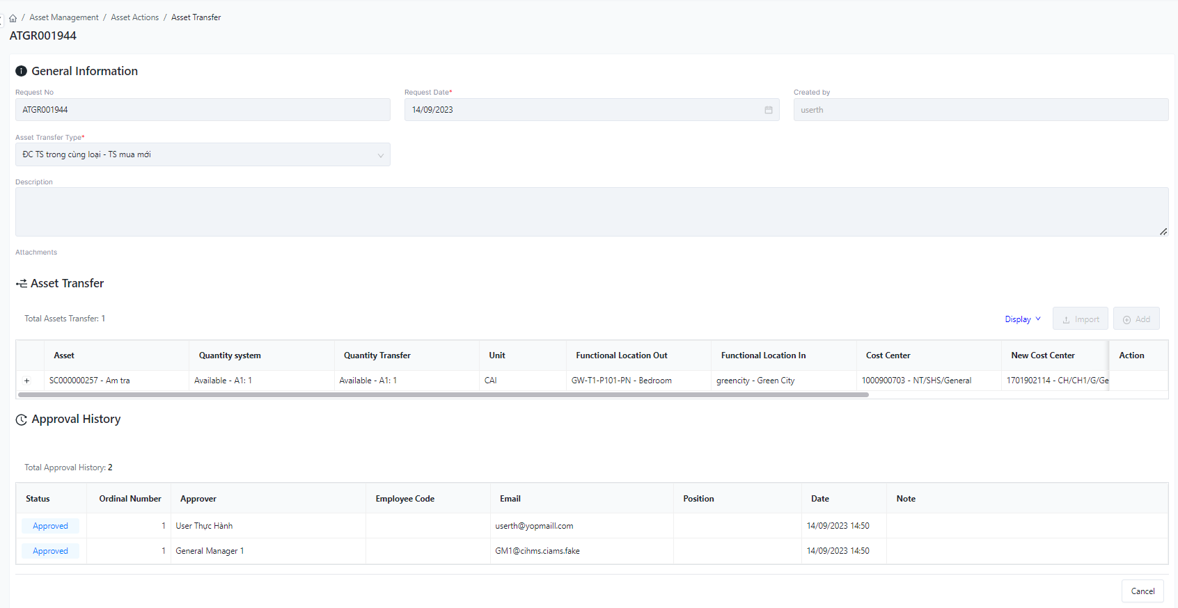 The screen manages the entire list of asset transfer of the facility |