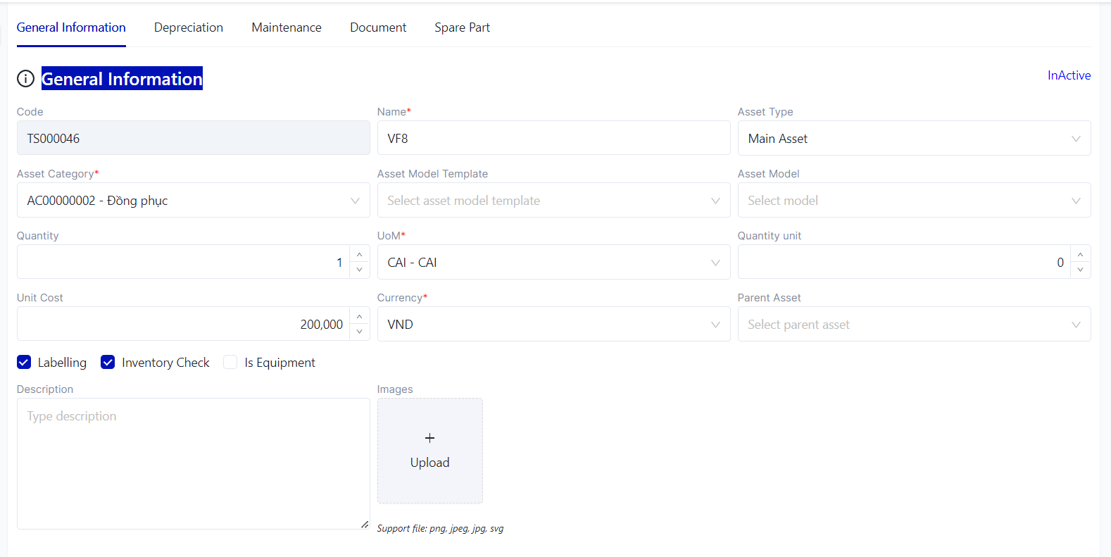 (2) Edit: To edit an asset, users can edit the asset name, description, upload images, and asset status...