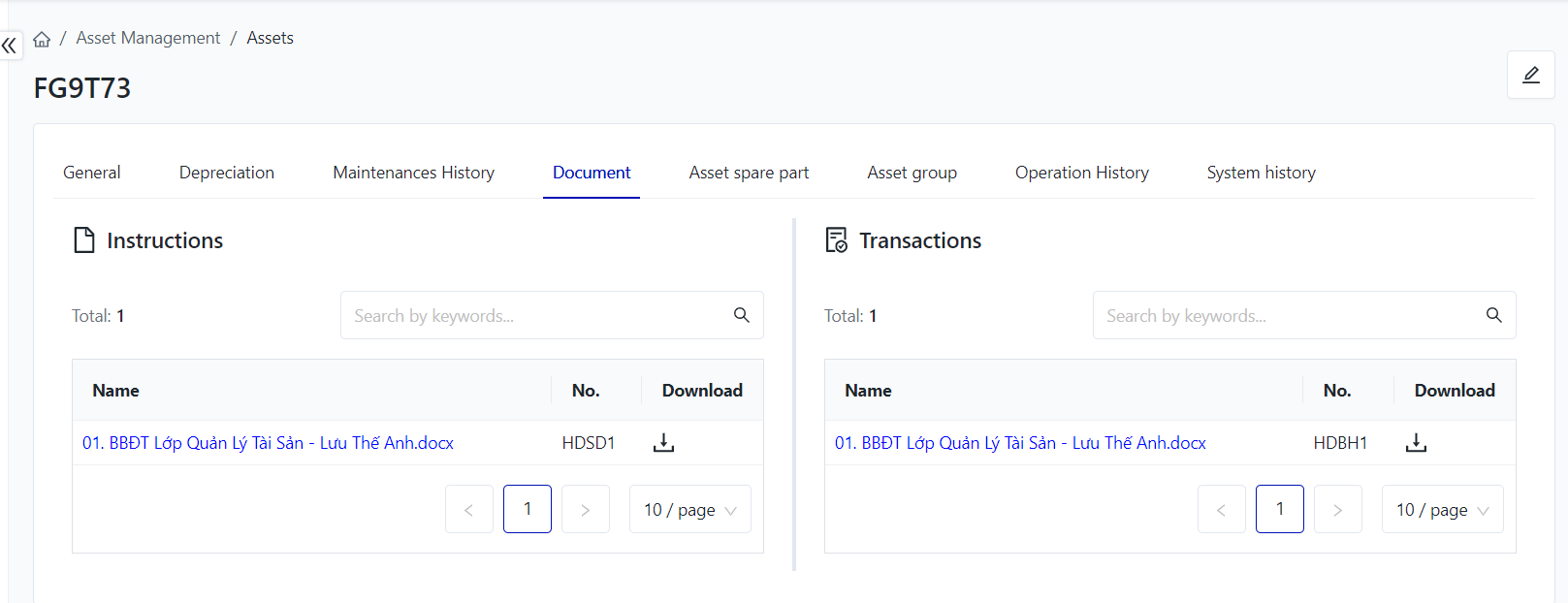 Search: Users enter search information in the search box, supporting search by "Asset code" or "Asset name".