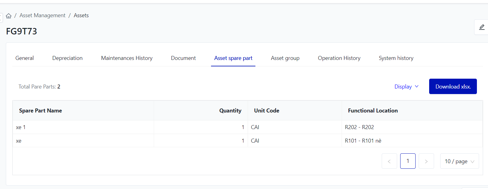 Asset spare part: To view detailed information about the components that come with an asset