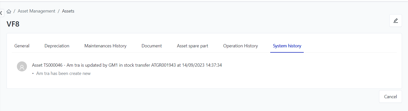 System history: To view detailed information about the activity history of an asset