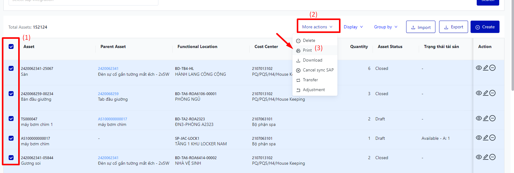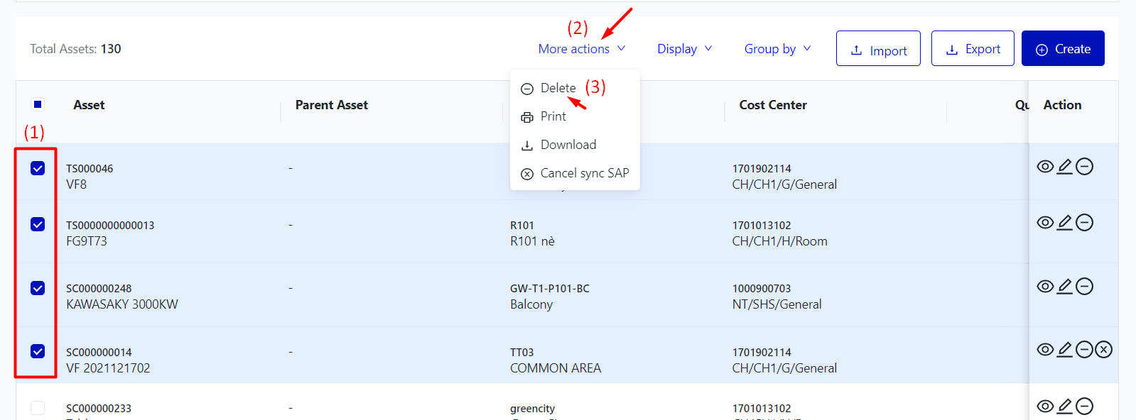 Cancel sync SAP: Select the assets that need to be cancel sync SAP → Click on the More actions → Click on the Cancel sync SAP → Click on Close
