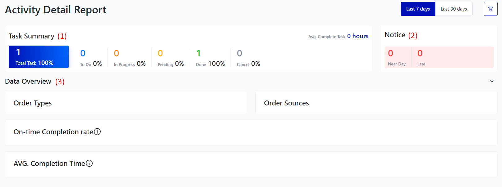 II. Information Fields ![]() (1) Task Summary: The system will display the total number of task based on the time frame that the user has filtered and searched for.