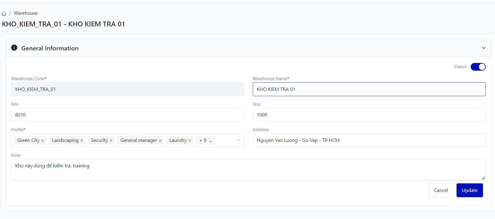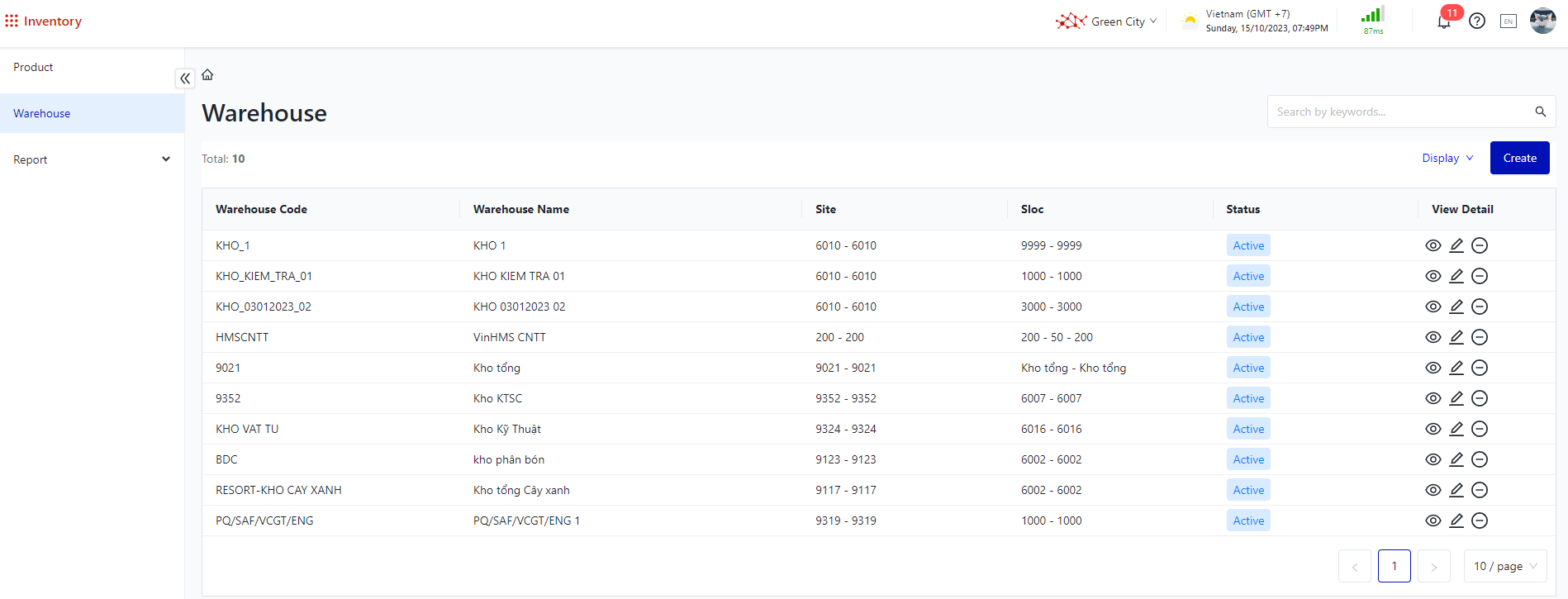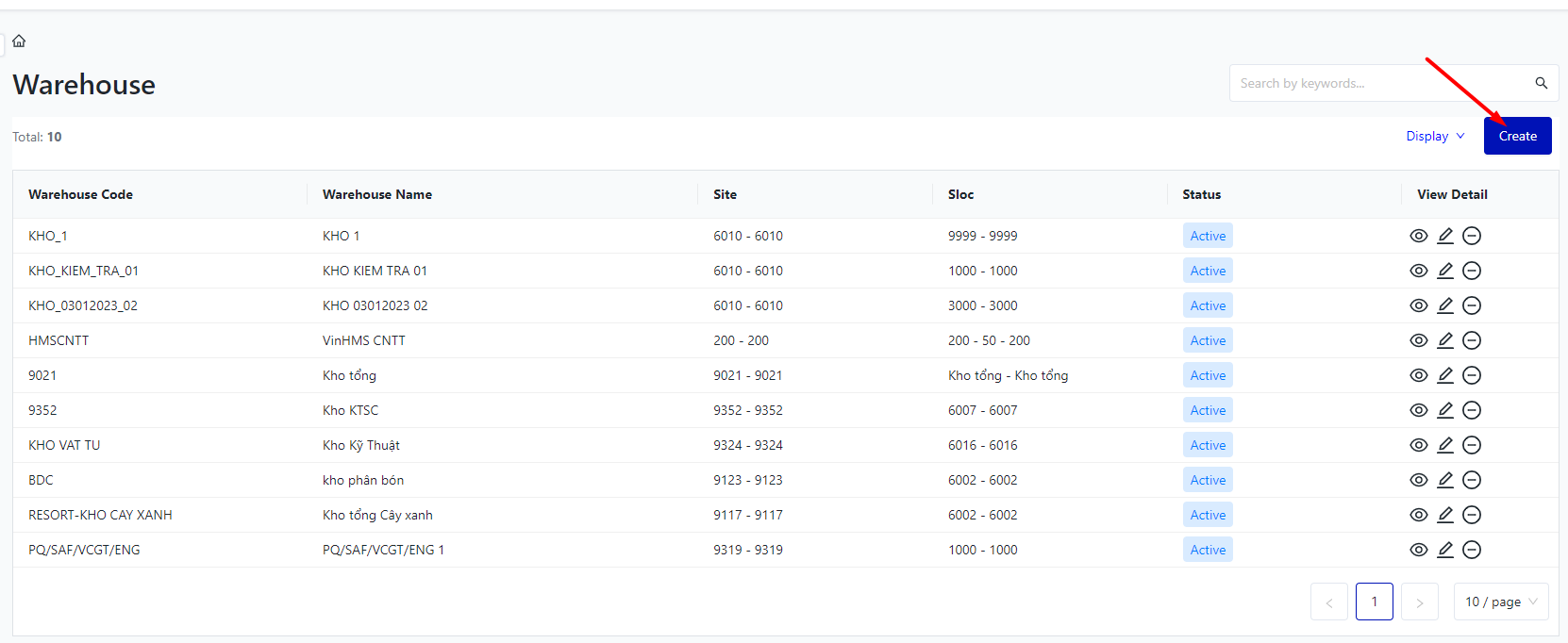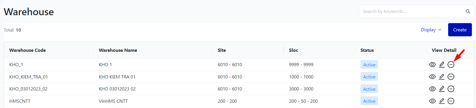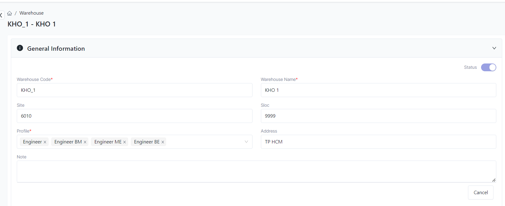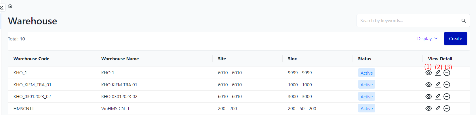 (1) View detailed information of the warehouse: ![]() (2) Edit the information of an inventory warehouse, such as the warehouse name, site, sloc, department, and address ![]()