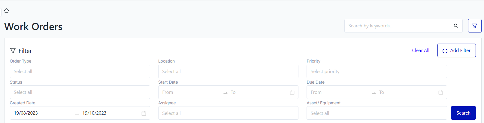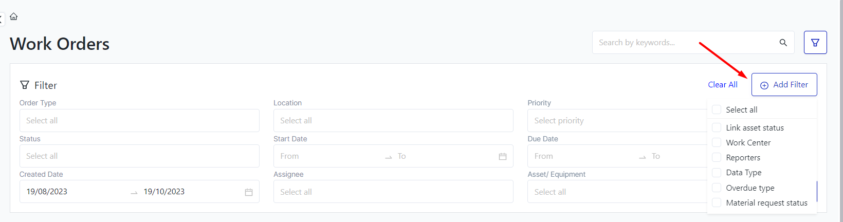 Add filter condition: In addition to the default filter conditions, users can also add other filter conditions for easier work order search.