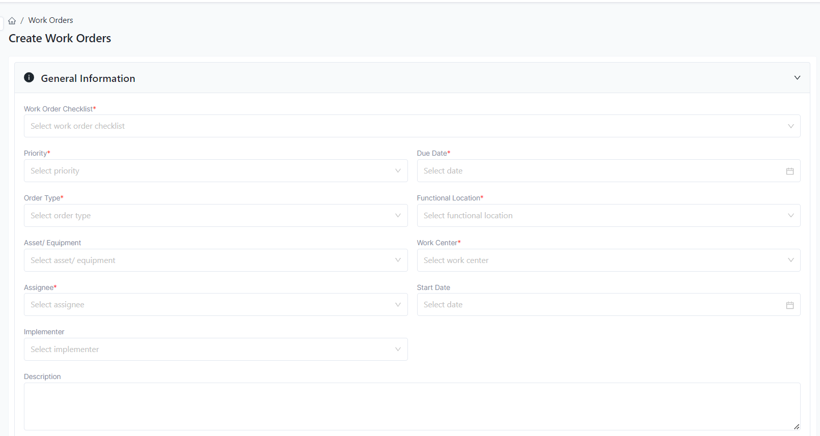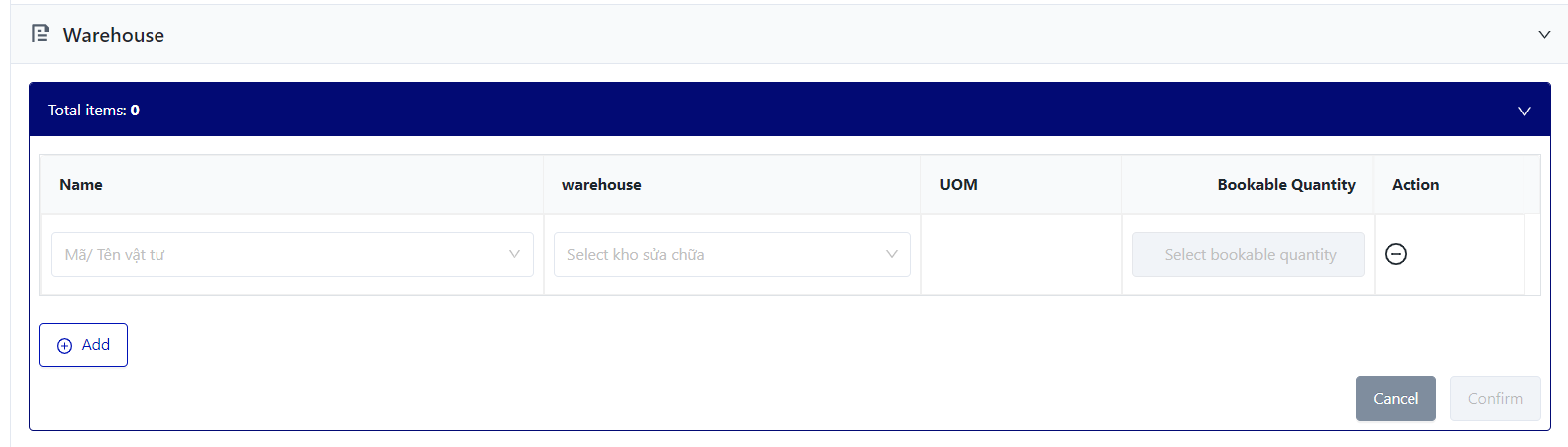 Warehouse: Used to create a request for the delivery/receive of materials for asset repair for the work order. These materials are usually taken from the Material Warehouse configured in "Inventory Management".