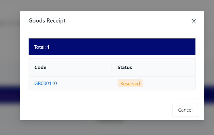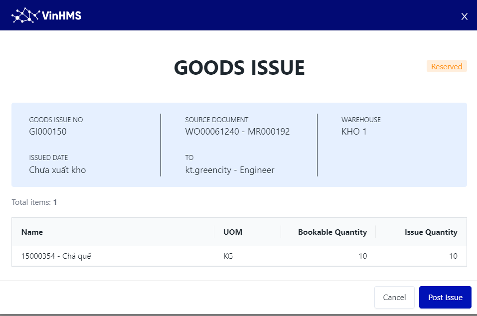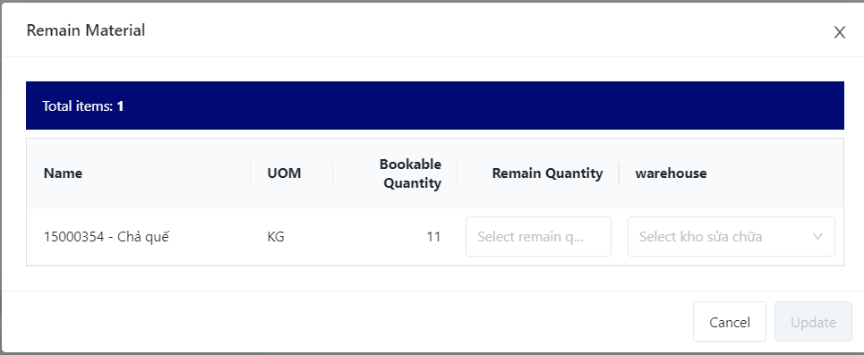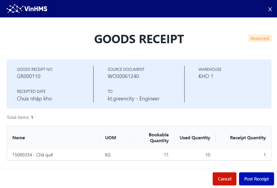 Material receive request: Users create a request to import materials after completing the asset repair, closing the work order, and returning the remaining materials to the warehouse. After selecting "Complete" for the work order, the system will display a notification screen to request the input of the remaining material quantity. Users update the quantity and the warehouse to return the materials to, then proceed to create the material receive request. After creating the receive request, users confirm the return of the materials to the warehouse.