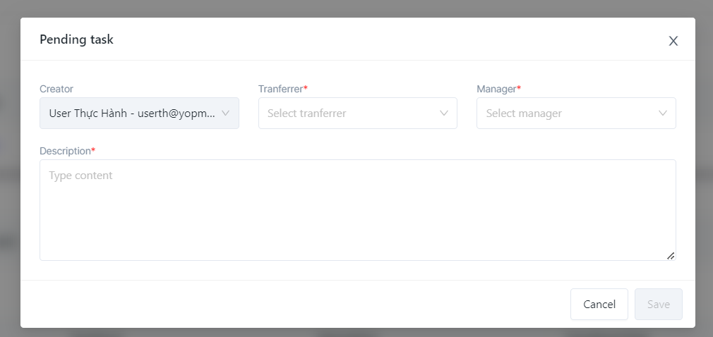 Pending tasks: Used to hand over unfinished tasks from assignee A to assignee B (new). Note: only hand over tasks when the task delivery note is in the "in progress" status.