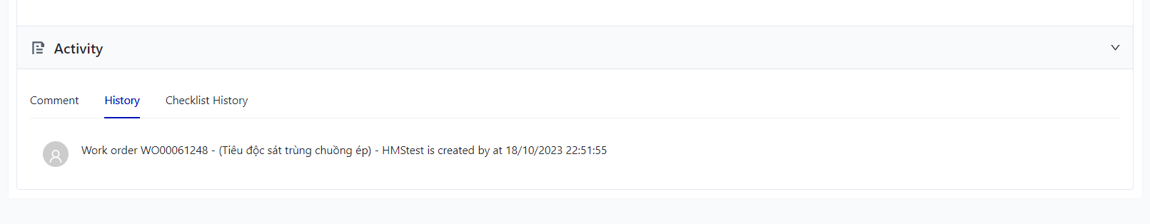 Activity: Users can view details of comments, activity history of the work orders or activity history of sub-tasks.