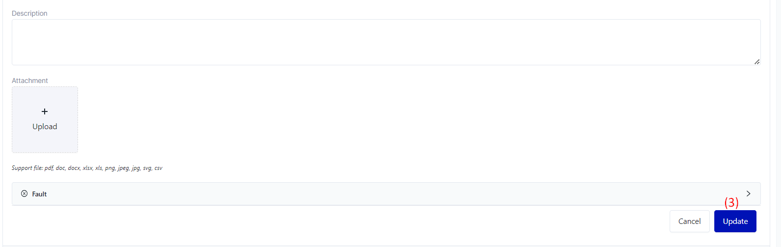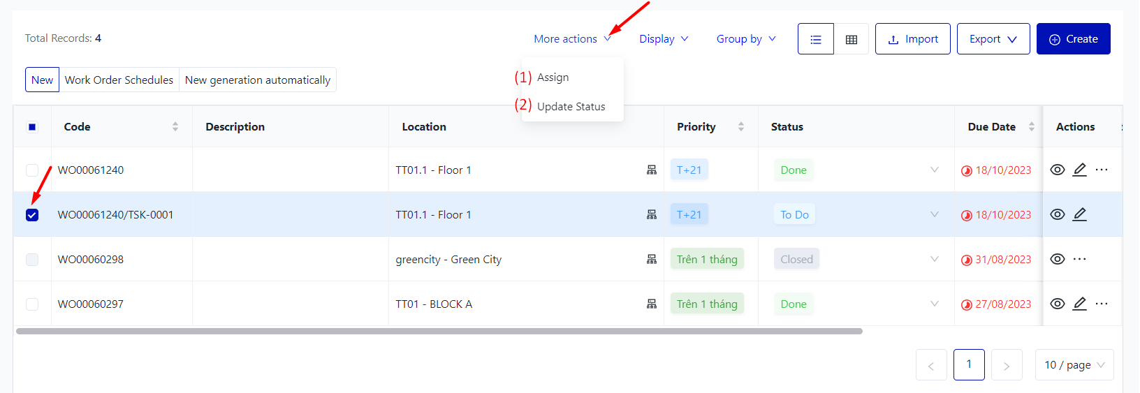 (2) Update status: Use this function to quickly update the status for work orders with the same status, and only quickly update for work orders with sources originating from work orders schedules. work orders related to repairing assets need to go to the work orders details to select the number of assets that need to be repaired, and when finished repairing, need to update the asset status again, so the function of updating the status in bulk cannot be used for these work orders.