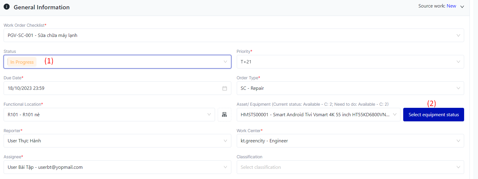 (1) Creating a new work order: Enter the required fields, note that for work orders related to asset repair, users only need to enter the asset code and the system will automatically fill in the functional area information containing that asset. After entering all the required information, select "Save" to create the work order.