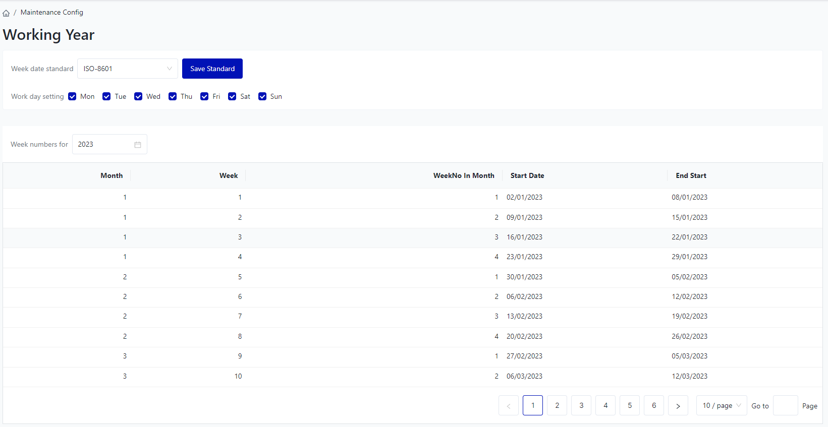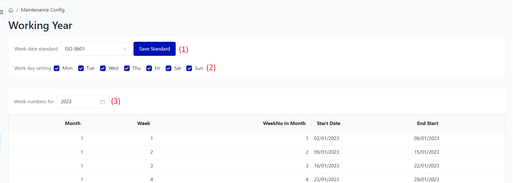 ![]() (1) Based on the standard working time in Vietnam, users will set the working year standard to ISO-8601. (2) Tick the working days boxes in case the property does not work for 7 days/week. (3) Select to view the weekly working information according to the year. |