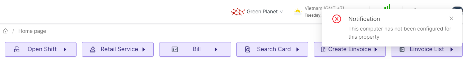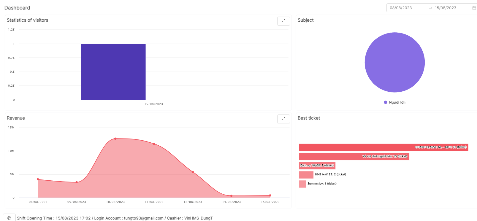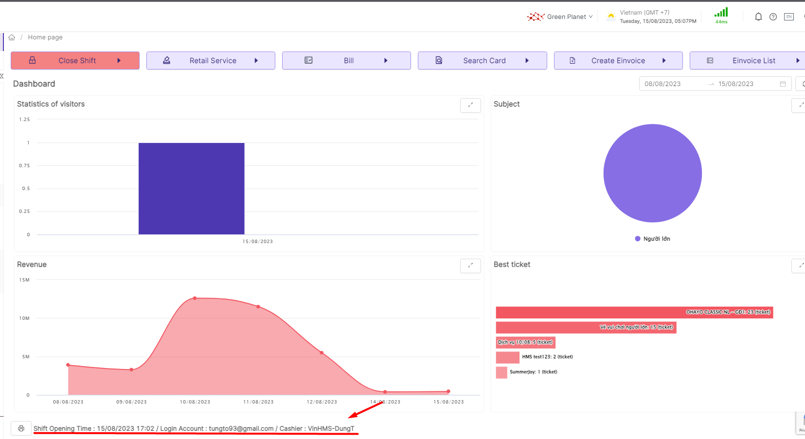 This screen displays the main functions of the system and provides an overview of the control panel and relevant data regarding revenue and customer traffic. |