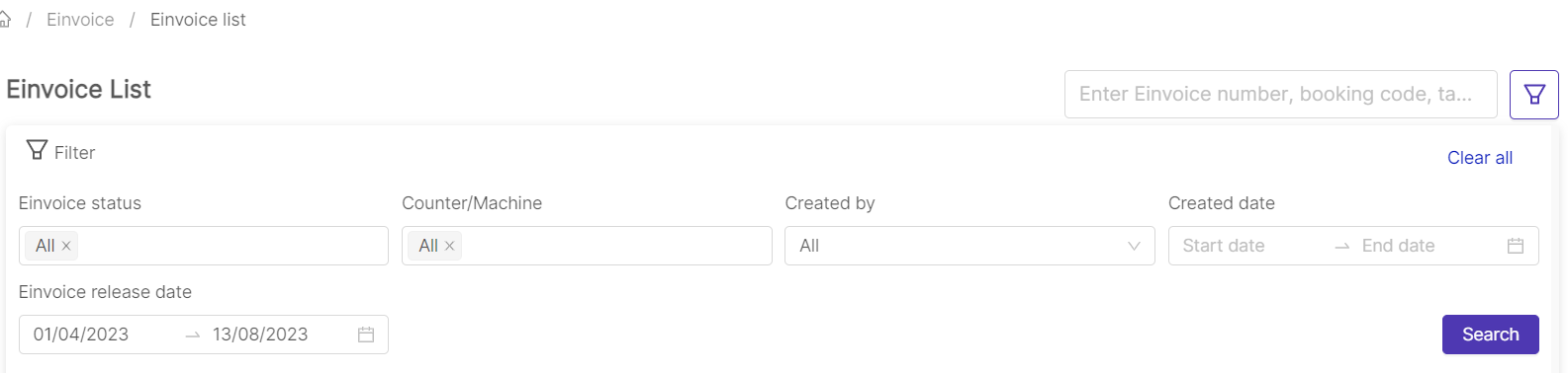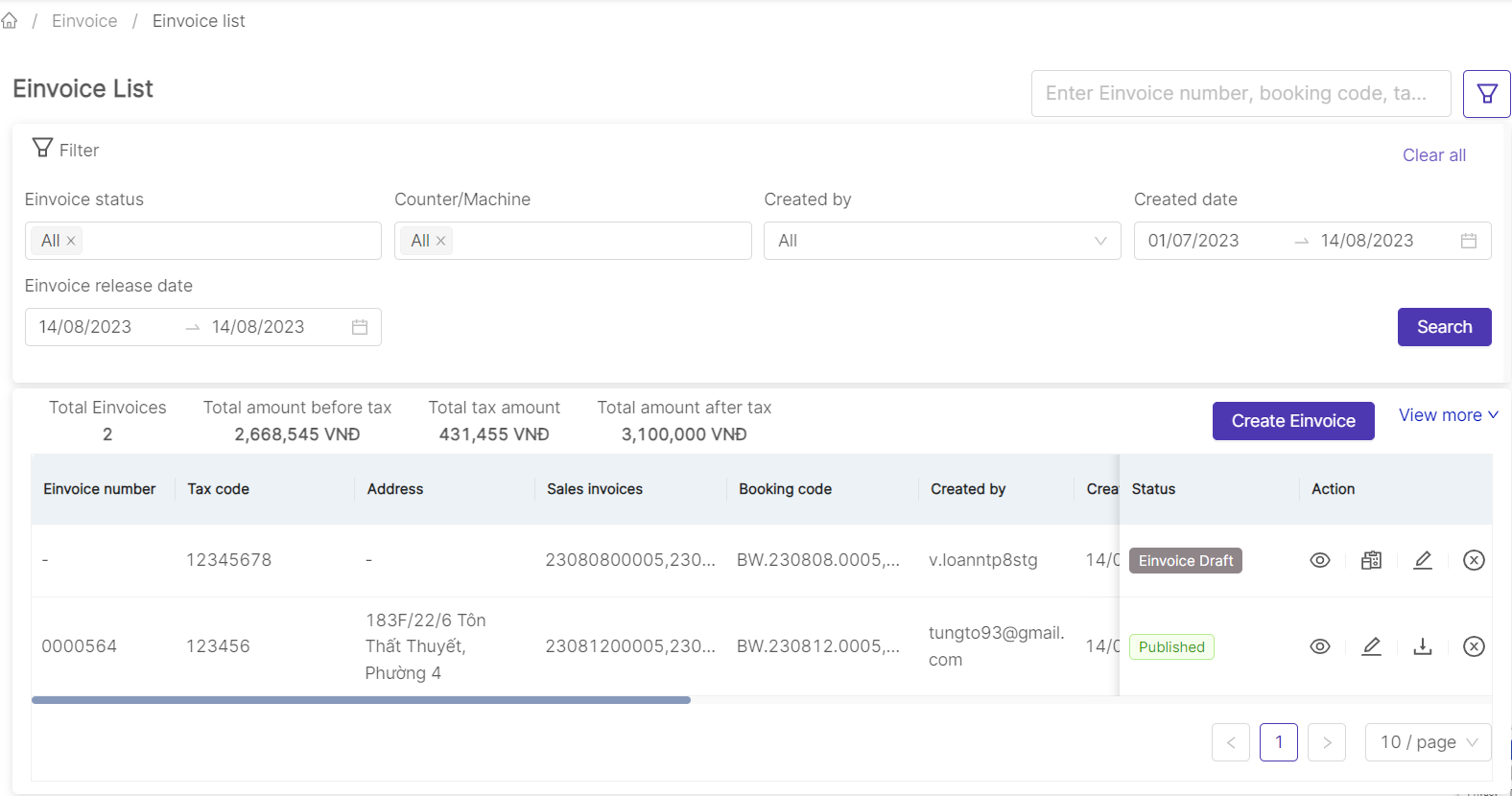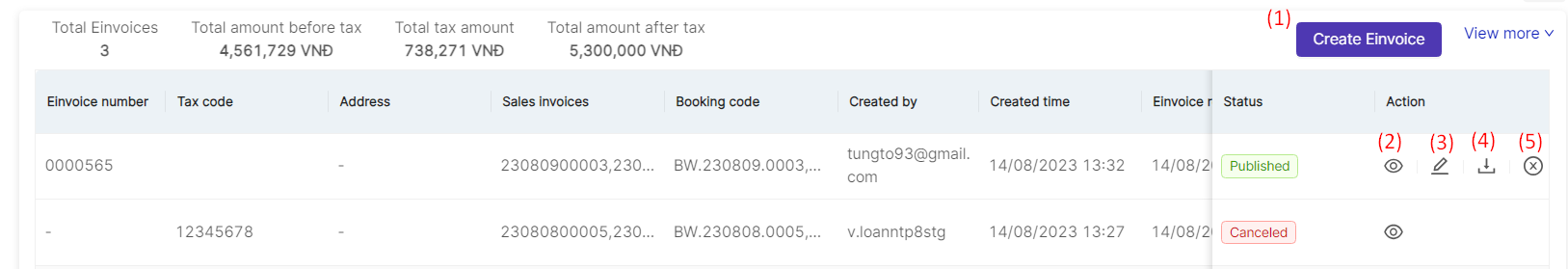 [Function buttons]![]() (1) Create E-invoice: users can view the detailed steps in the "Create e-invoice" section (2) View detailed an E-invoice: Click on the icon ![]()