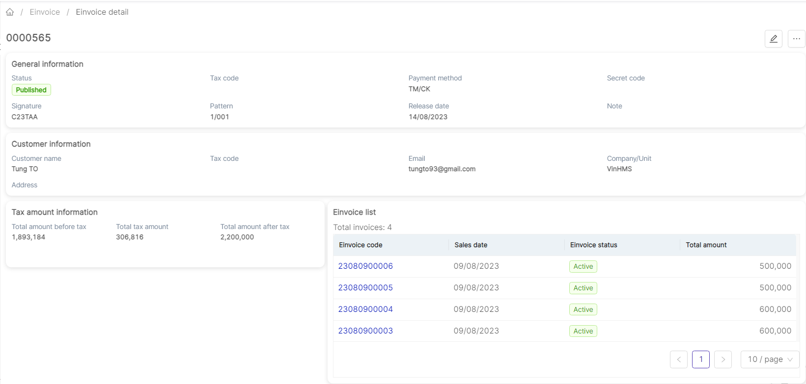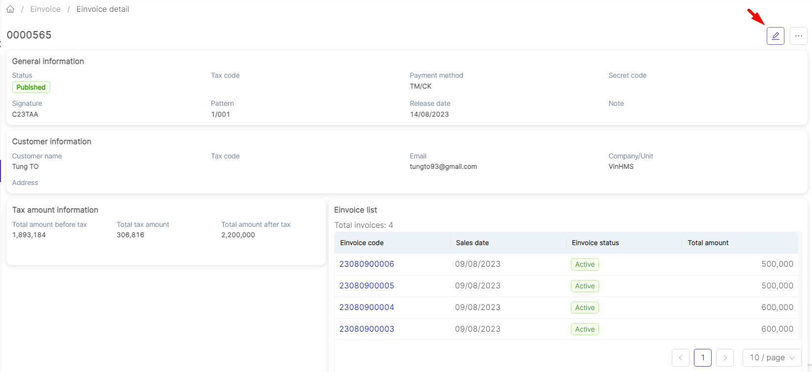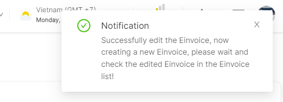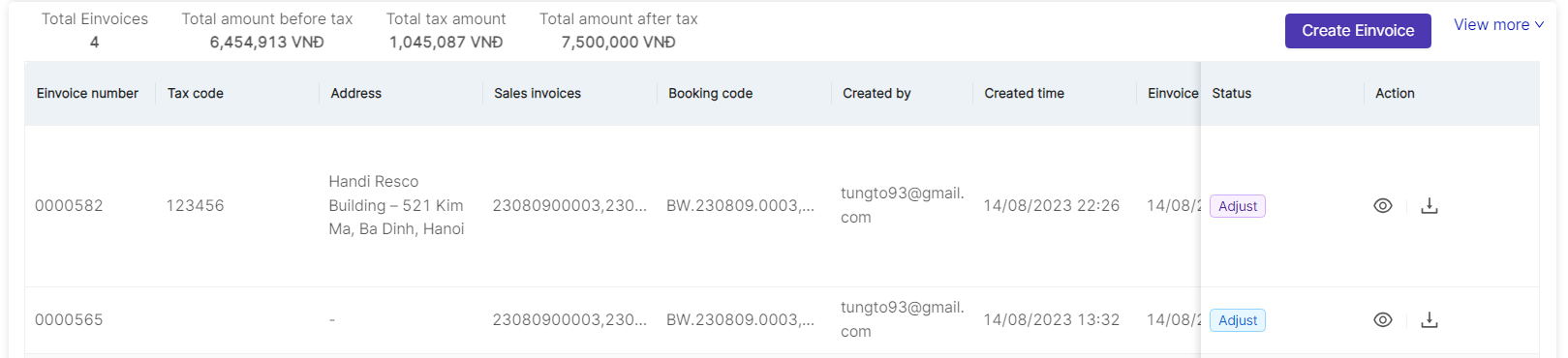 (3) Edit E-invoice: if users need to change information, select the → After making changes to an e-invoice in the published status, the system will generate a new e-invoice with the status "Adjust " and the old invoice will have the status "Adjusted" ![]() ![]() (4) Download E-invoice: Click on the icon (5) Cancel E-invoice: Click on the icon |
