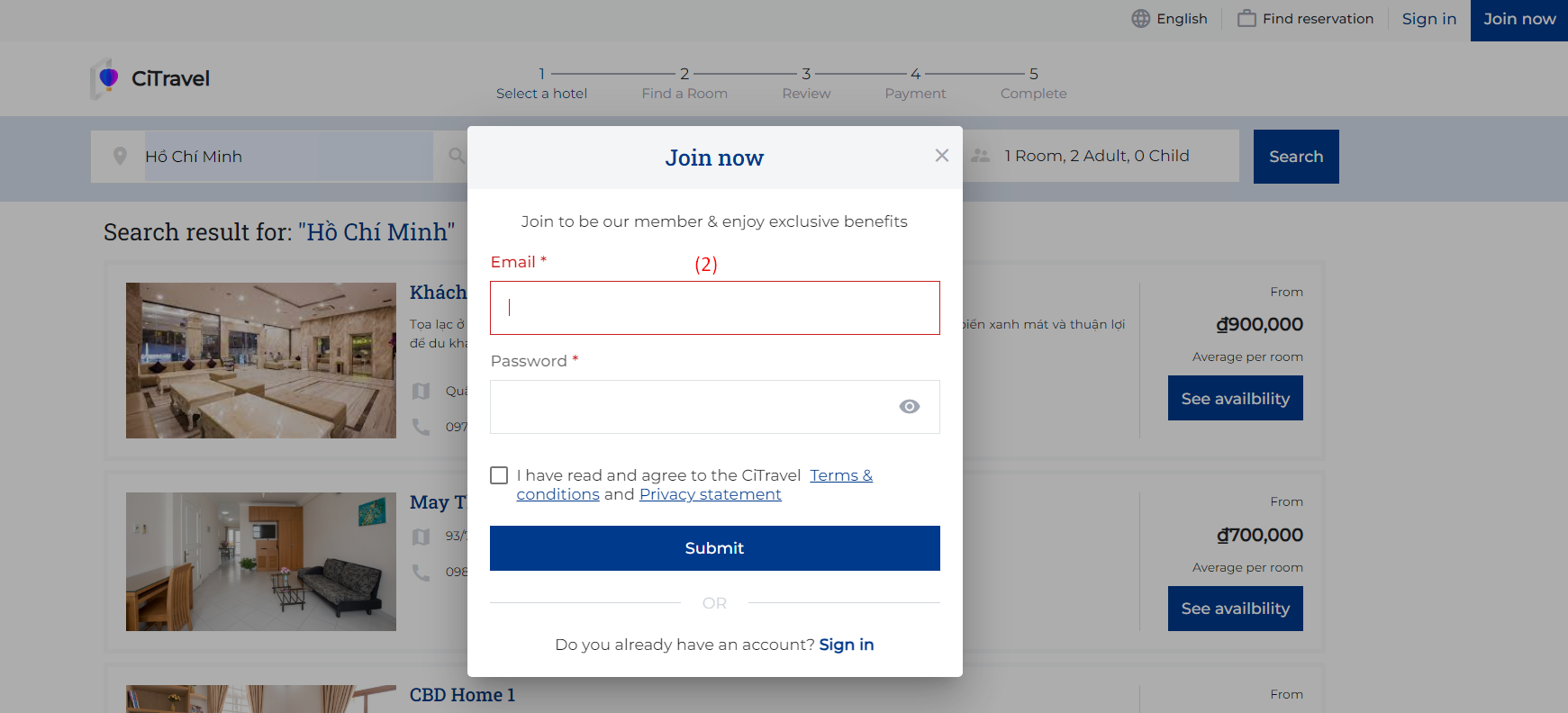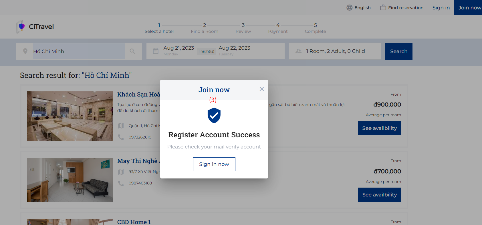 To register an account on the CiTravel system, guests only need to follow these simple steps: (1) To create an account on the CiTravel system, go to the homepage screen and select “Join now” to begin the registration process. ![]() (2) Enter your email address and password. Click on the "Submit" button to complete the registration process. ![]() (3) After completing step (2), the system will display a notification that the account registration was successful. Users can select "Sign in now" to log in to the system. ![]() |