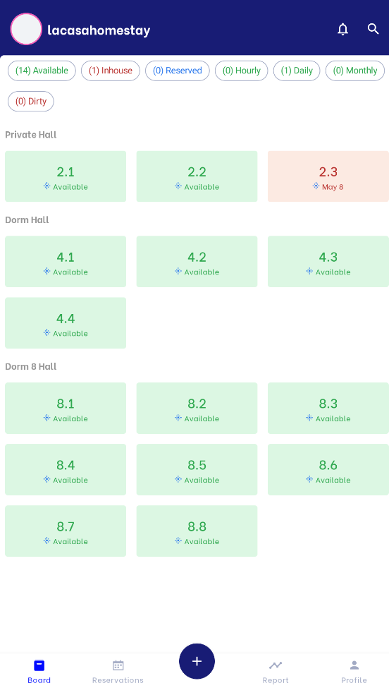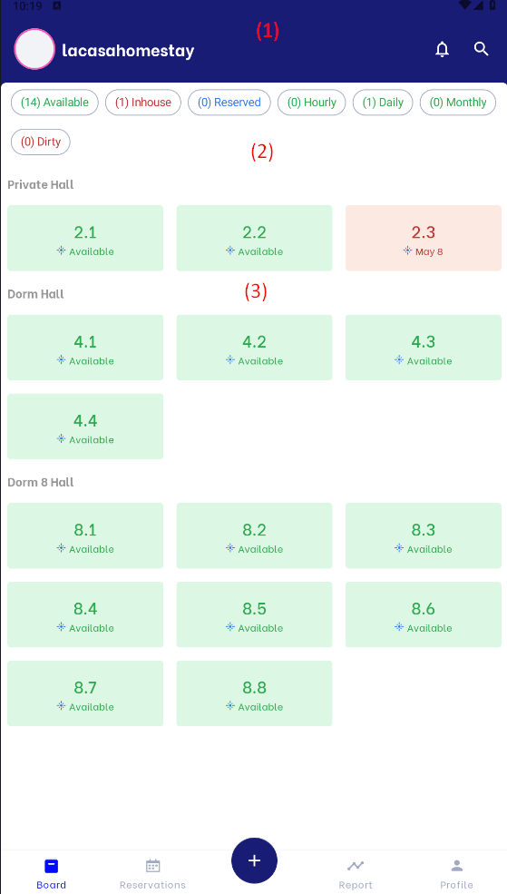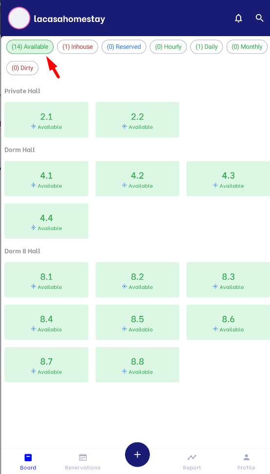 Note: Users can swipe down the screen to refresh the room diagram At the "Room Board" screen, users can create a new booking by clicking on any Available room to create a new booking corresponding to the selected room information. |