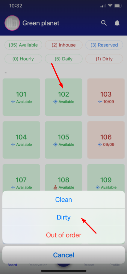 ![]() (3) Room plan & Room status: Click on the room number to change the room status: clean room, dirty room, out of order. ![]()