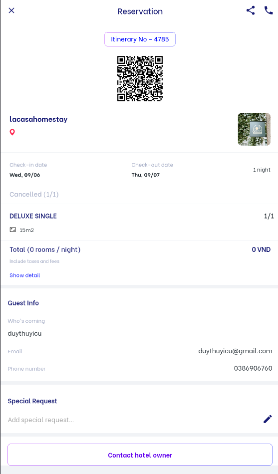 On the "Canceled" screen, customers can quickly search for a "Room reservation" by entering the itinerary code in the "search" box. This includes itinerary number that have been canceled in the customer's reservation ![]() On the "Canceled" screen, customers can view detailed information about a "Room reservation" that has been canceled, including: