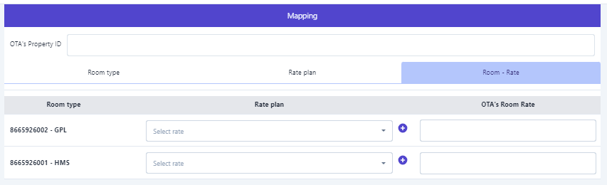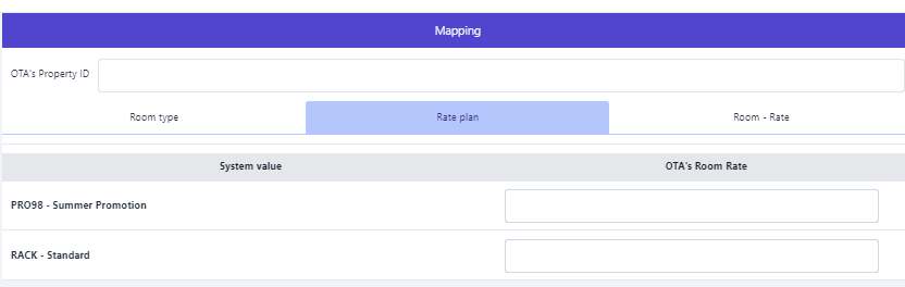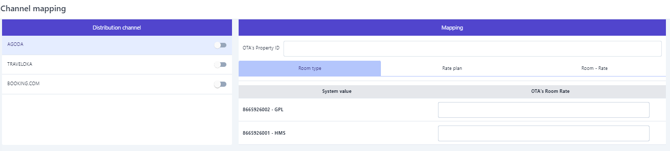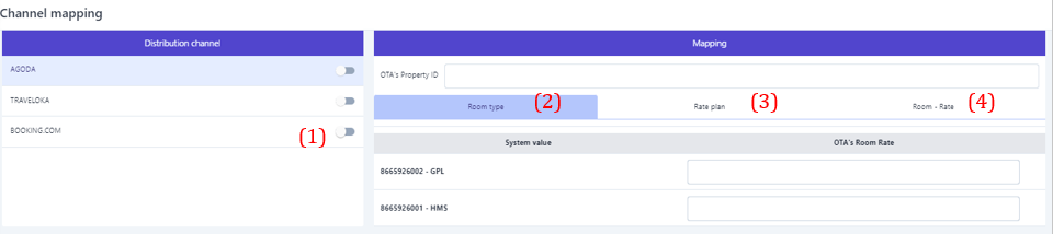 ![]() (1) Turn on the sales channel that needs to be configured. (2)Room type: Enter the corresponding room type information on the online booking channel (OTA) ![]() (3) Rate Plan: Enter the pricing information on the online booking channel (OTA) that corresponds to the pricing at the hotel. ![]() (4) Room - Rate: Select the corresponding rate with the room type, then enter the relevant information on the online booking channel (OTA). |