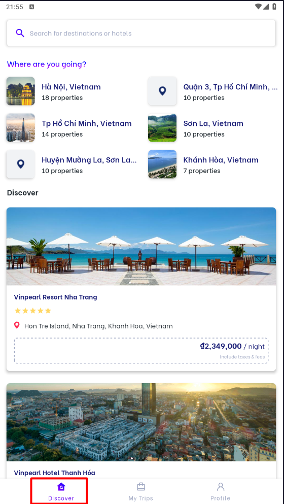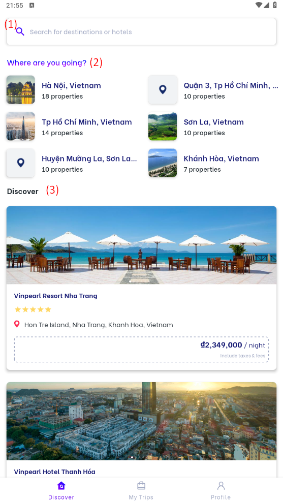 ![]() (1) (1) To search for a destination or hotel, enter the information of the place you want to go or the hotel you want to stay at to receive suggestions related to the information you are looking for. (2) Where are you going? Suggest prominent landmarks, cities, and hotels for users to refer to and choose from. (3) Explore: Suggest hotel information and corresponding prices for the suggested hotels |