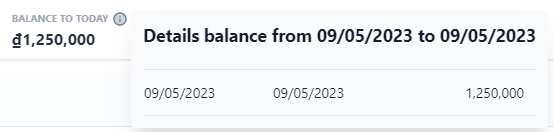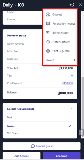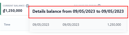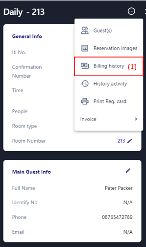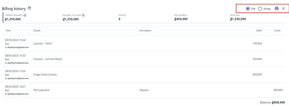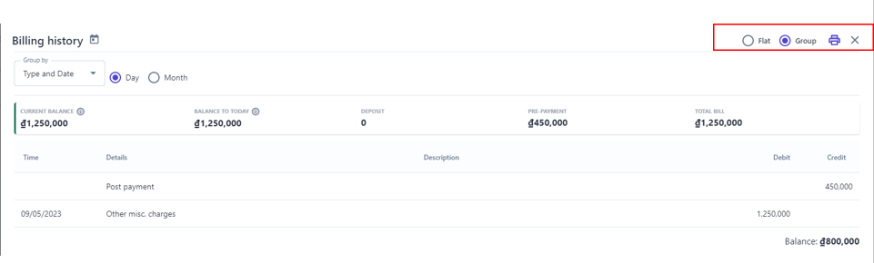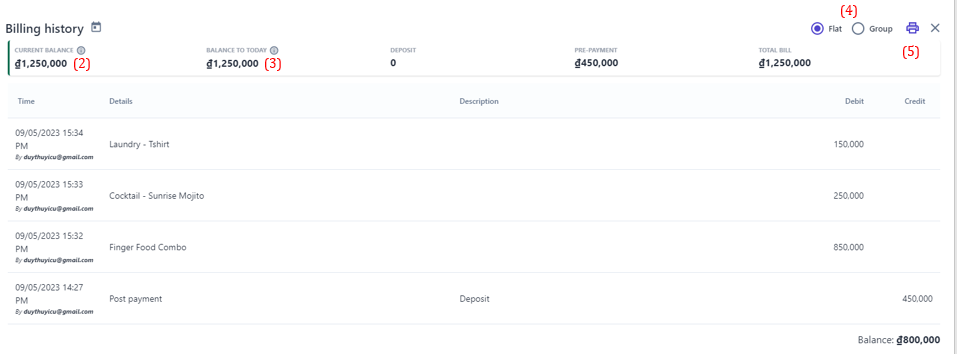 ![]() 3. Billing History ![]() (1) Select billing history to view all transactions of the booking during the stay ![]() (2) Current Balance: Click on the icon:chi_tiết: to view detail balance for the entire stay period. ![]() (3) Balance to today: Click on the icon:chi_tiết: to view the booking balance details up to today. ![]() (4) View transaction history in 2 ways: