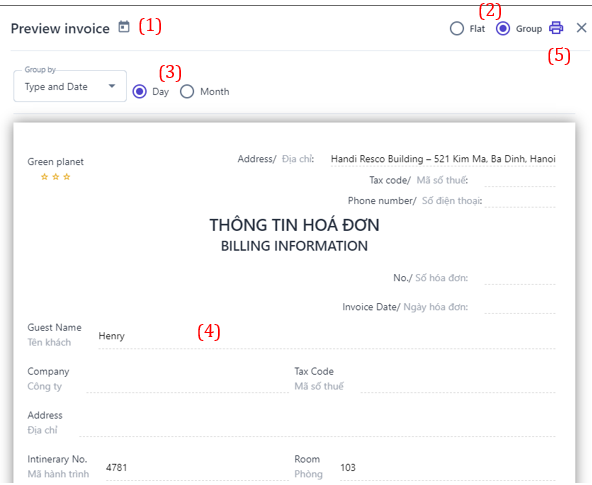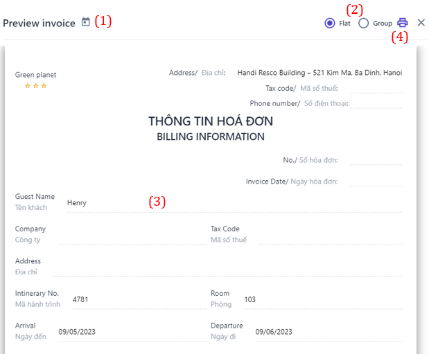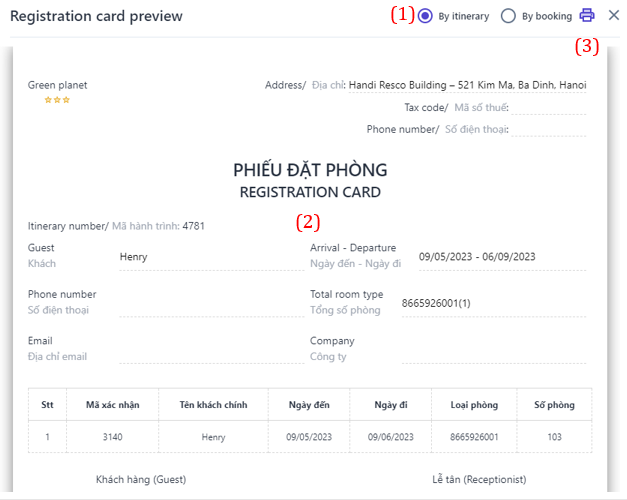 4. History Activity 5. Print Reg Card ![]() (1) Users can choose to print the registration card by itinerary code or by booking. (2) Users can edit or add/remove information fields if necessary. (3) Select the icon :in: to print the registration card. 6. Print Billing: Similar to the information in section (5) for printing invoices in the transaction history ![]()