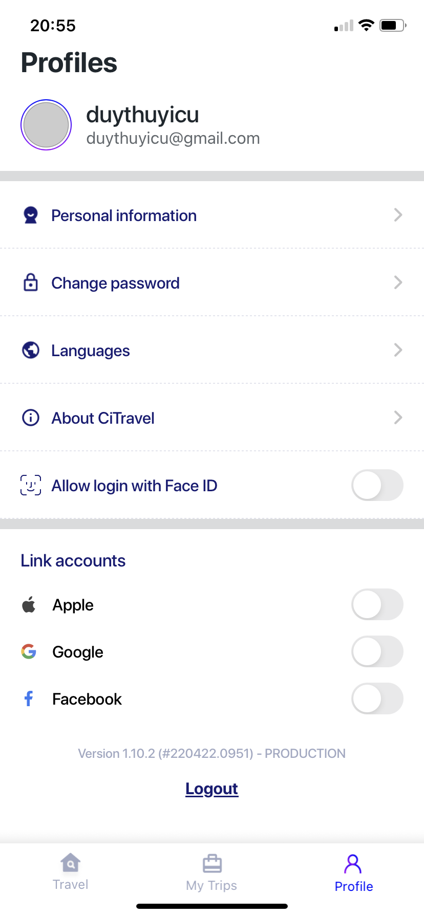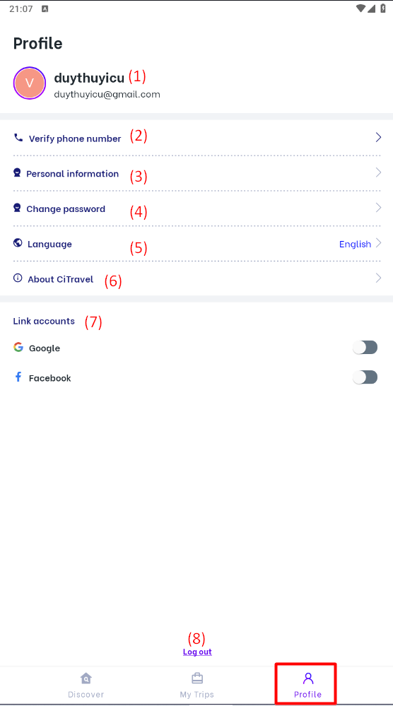 (4) Change password: Click on the option to enter the new password ![]() (5) Language: To switch between Vietnamese and English languages (6) About CiTravel: see details at [ENG] CiTravel System and Policy Information ![]() (7) Link accounts: Click on the option to enable or disable the link