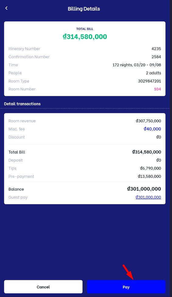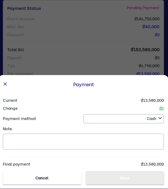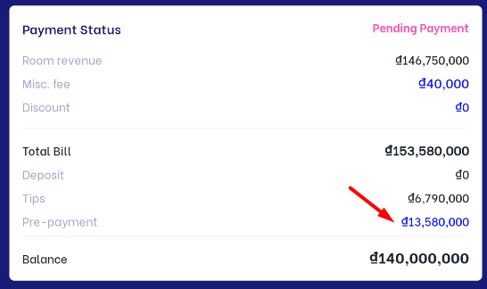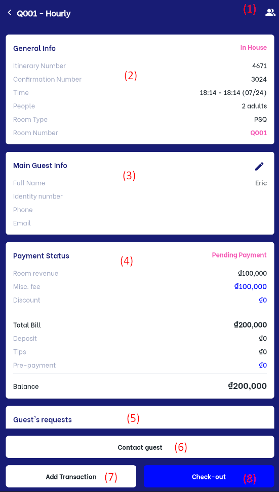(3.3) Main guest info: Click on :chỉnh_sửa: button to edit guest information such as name, phone number, and email (3.4) Payment status: Display the payment status information of the booking Pre payment: Do the following steps to enter the paid amount (pre-payment) ![]()