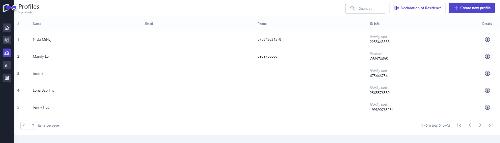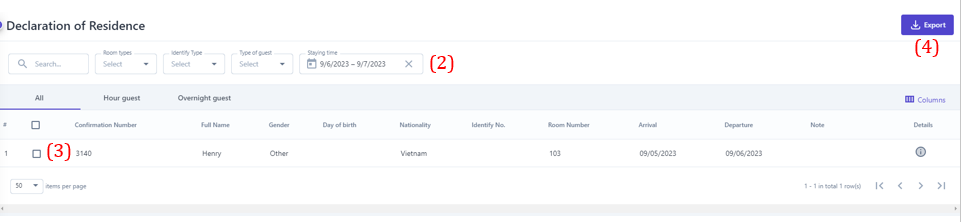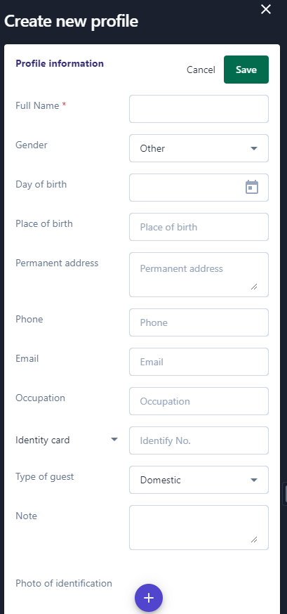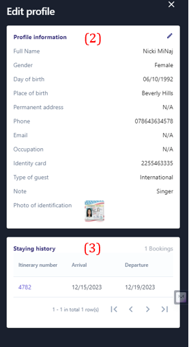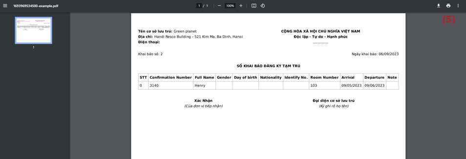 2. Details of guest profile ![]() (1) On the Guest Profile screen, select the icon :chi_tiết: to view the guest profile details. ![]() (2) Users can edit/update the information fields in the guest information section (3)View staying history, click on the itinerary code to view the guest's booking history details. 3. Declaration of residence: ![]() (1) On the Guest Profile screen, select “Declaration of residence” ![]() (2) Filter or search for relevant booking information to create a stay declaration. (3) Select the bookings for which to print the stay declaration (4) Select 'Export' to preview the declaration. ![]() (5) Select the icon :tải_xuống: to download the declaration file or select the icon :in: to print. 4. Create new profile: Do following steps below to create new profiles ![]() (1) Select “Create New Profile” ![]() (2) Please fill in all required fields as picture. (3) Select the icon:tạo_mới: to upload photo of identification (4) Select “Save” to complete |