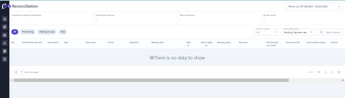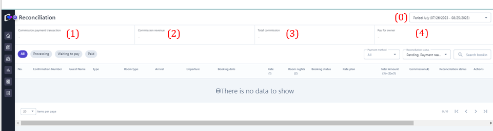 ![]() (0) Select the monthly settlement cycle to view. (1) Commission payment transactions: Displays the number of commission payment transactions for partners in the settlement cycle. (2) Commission revenue: The total revenue of the hotel calculated as commission for the partner. (3) Total commission amount: The total commission amount based on commission revenue. (4) Pay for owner: The amount that the partner needs to pay to the hotel ![]() (5) Select the settlement statuses to view. (6) Filter by payment method: Online payment/Pay at the hotel. (7) Select to view by settlement statuses: Pending/Waiting for payment/Successful/Failed/Paid/Not processed. (8) Search for bookings by information such as Guest Name, Confirmation Code... (9) Select the icon :chi_tiết: to view detailed booking information. (10) Select the icon:xác_nhận: to confirm the booking reconciliation operation with the partner. |