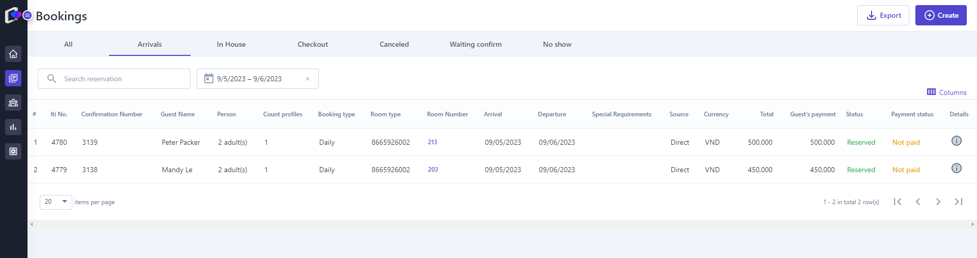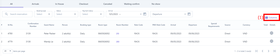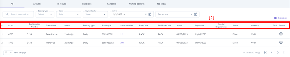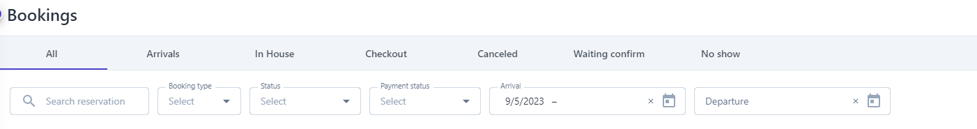 The screen displays the entire list of bookings that have occurred in the system and categorizes them based on their status:All: Includes all bookings filtered by arrival date. |
