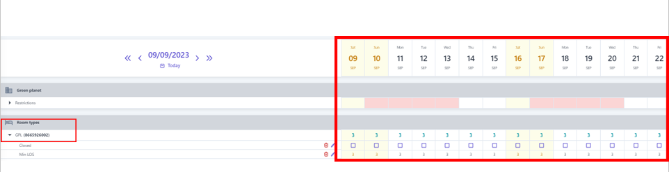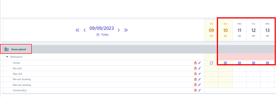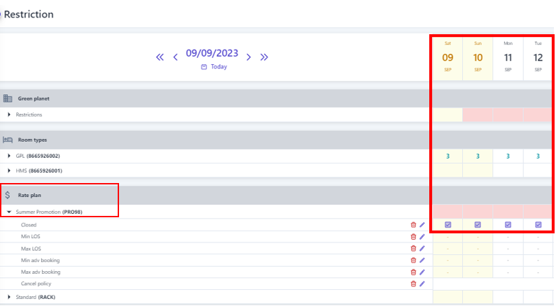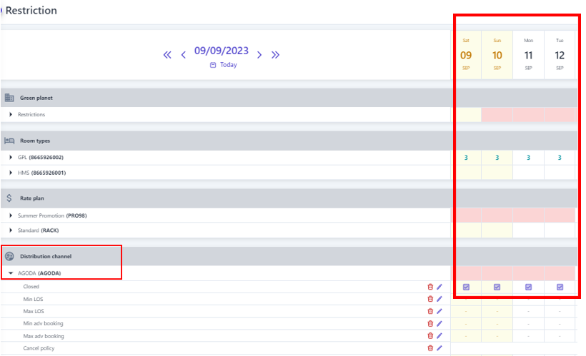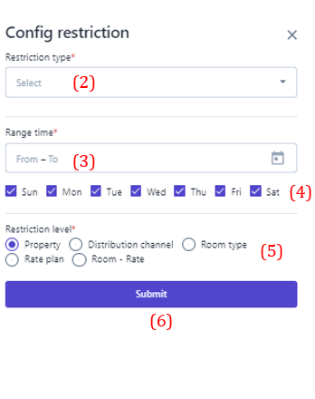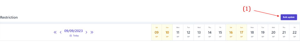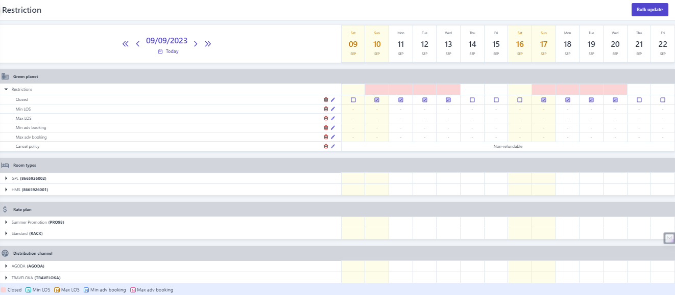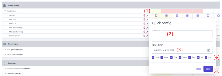 3. Create restriction ![]() ![]() (1) Select “Bulk Update” (2) Select the type of restriction to be set. Note that restriction related to dates such as minimum nights/maximum nights/minimum advance booking/maximum advance booking... need to enter the number of days/nights to apply the restriction . (3) Select the icon :thời_gian: to select the time range to apply the restriction. (4) Select specific days of the week to apply the restriction within the selected time range in step (3). (5) Select the level of restriction: apply the type of restriction. (6) Select "Save" to complete the restriction configuration. In addition, users can quickly create restriction as follows: ![]() (1) Determine in advance the Room type/Rate/Distribution channel that needs to apply the restriction, select the type of restriction to be performed, then select the icon :edit:to quickly adjust the restriction. (2) When the user selects to adjust the Minimum nights restriction, it is necessary to enter the limited minimum number of nights, similarly with other types of restriction, at this step, it is also necessary to enter the value that needs to be restriction. (3) Select the icon :thời_gian: to select the time range to apply the restriction. (4) Select specific days of the week to apply the restriction within the selected time range in step (3). (5)Select "Save" to complete the quick constraint creation To delete the restriction, selects the icon :xóa: at the end of the restriction type. 4. Manage the restriction