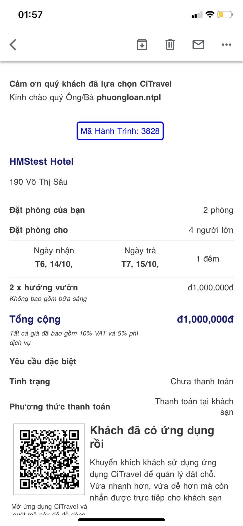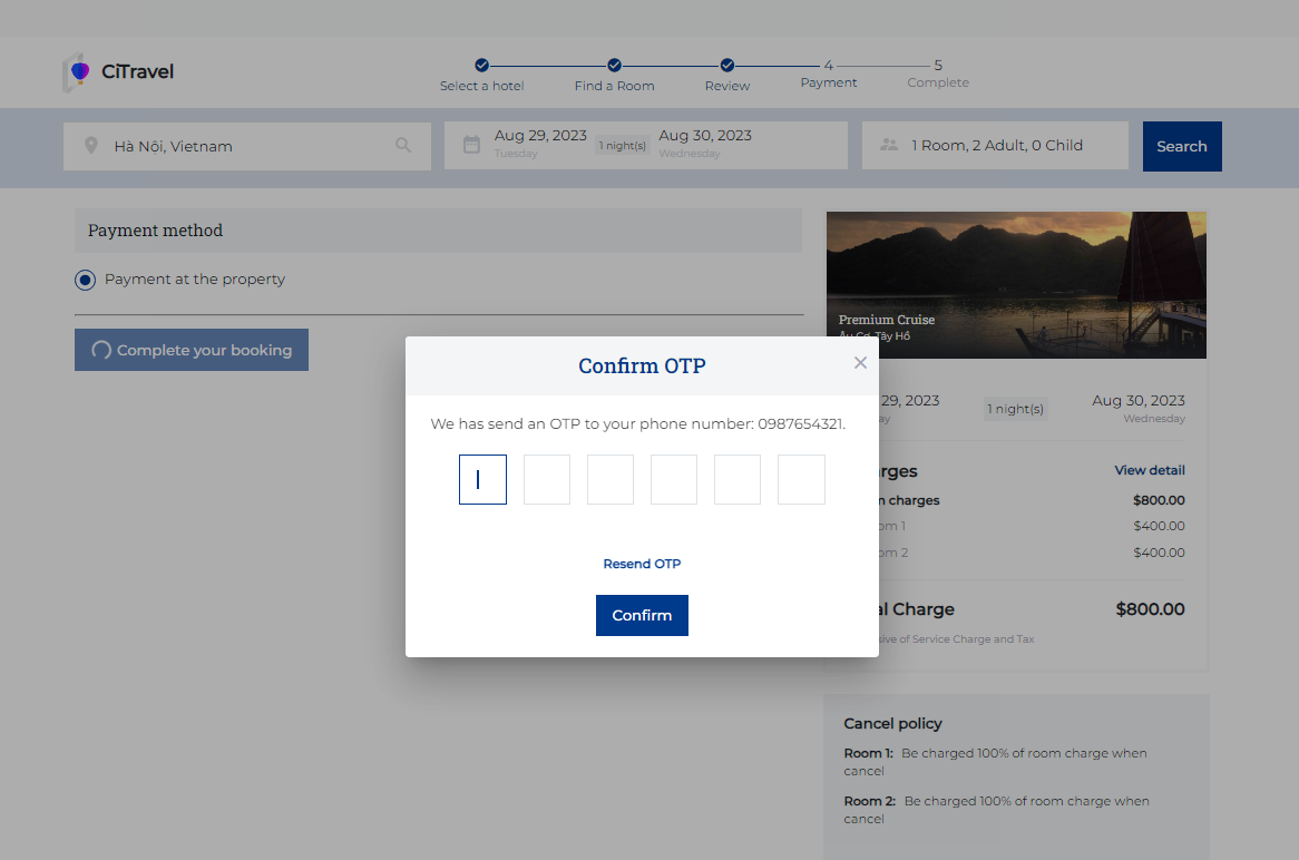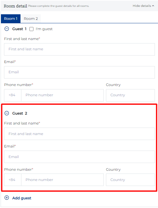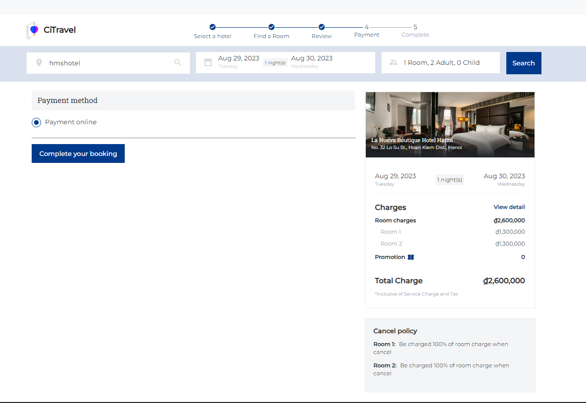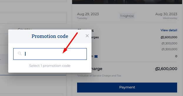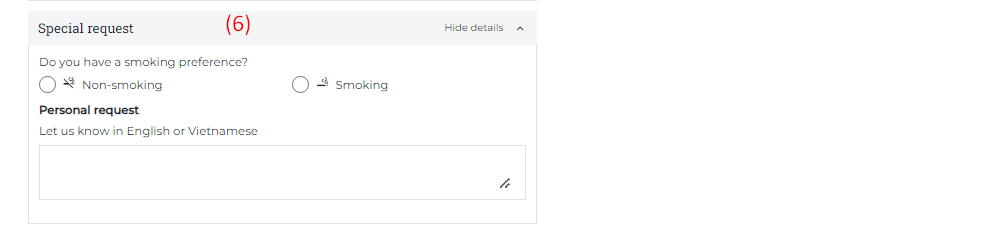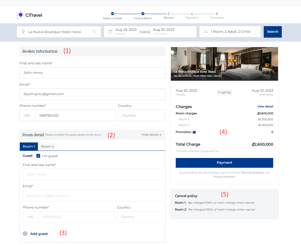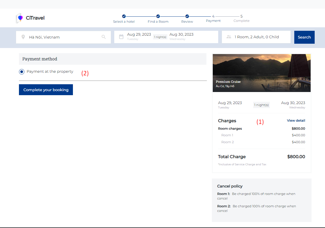 (3) Add Guest: Select "Add Guest" when there are 2 or more people staying in the room. ![]() (4) Promotion: Enter the Promotion code if guest has a promotion code: ![]() (5) Users need to review the Cancel policy before making payment (6) Special request: In case the guest has any special requests, enter the information in the personal request section. Step 3. Review: ![]() (1) Users need to review the reservation details before making payment. (2) Select a payment method: Payment at the property or payment online Select “Complete your booking” to make payment Step 4. Payment: