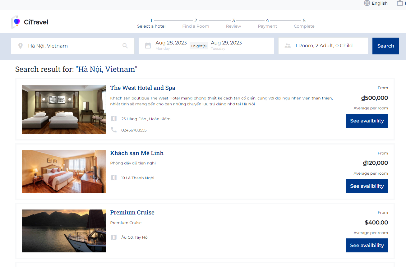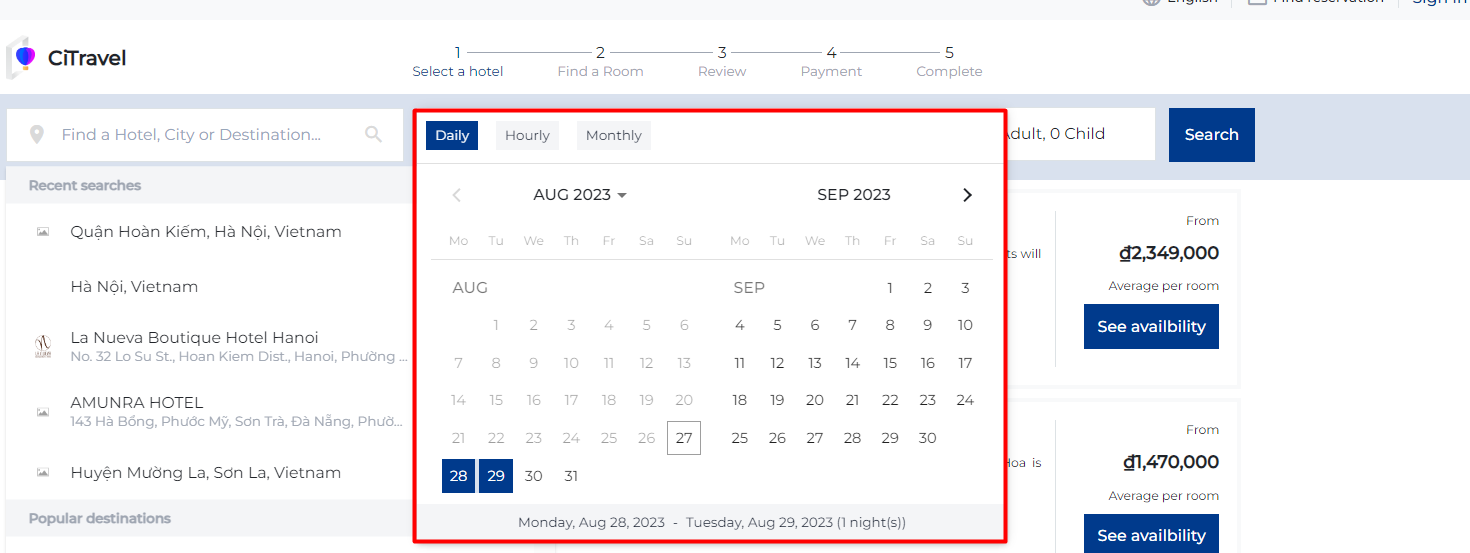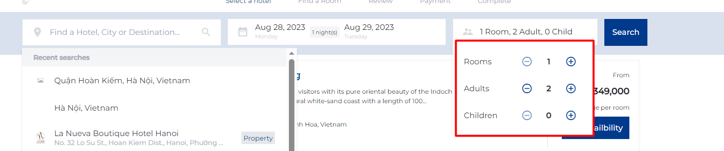 (2) Select the duration of stay based on the room type, either hourly, daily, or monthly ![]() (3) Select the number of rooms and the number of guests for a hotel booking, click on :cộng: or :trừ: to increase or decrease the quantity of rooms/guests ![]() Click on the "Search" button to find the results: ![]() II. Steps to book a hotel roomStep 1. Select a hotel: