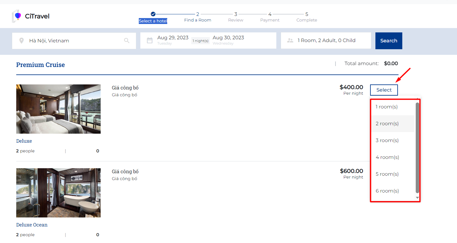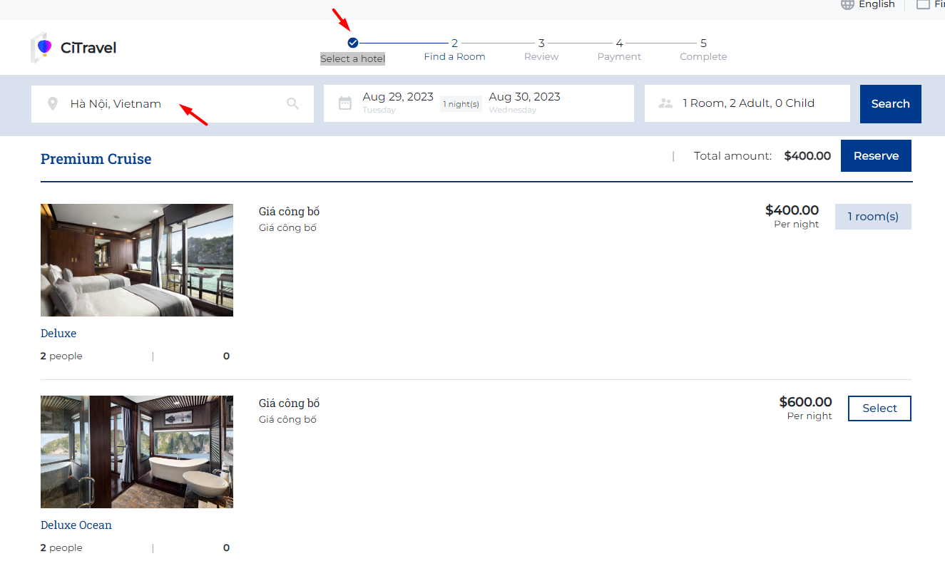 ![]() Step 2. Find a Room: This step includes detailed reservation ![]() ![]() (1) Booker information: Users need to enter all the required information fields such as Full Name, Email, Phone Number.. (2) Room Detail: