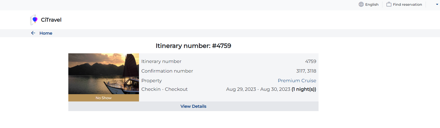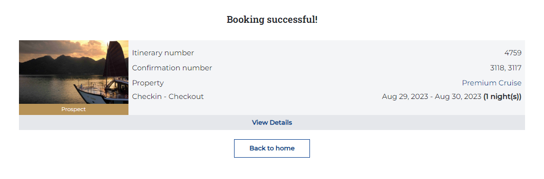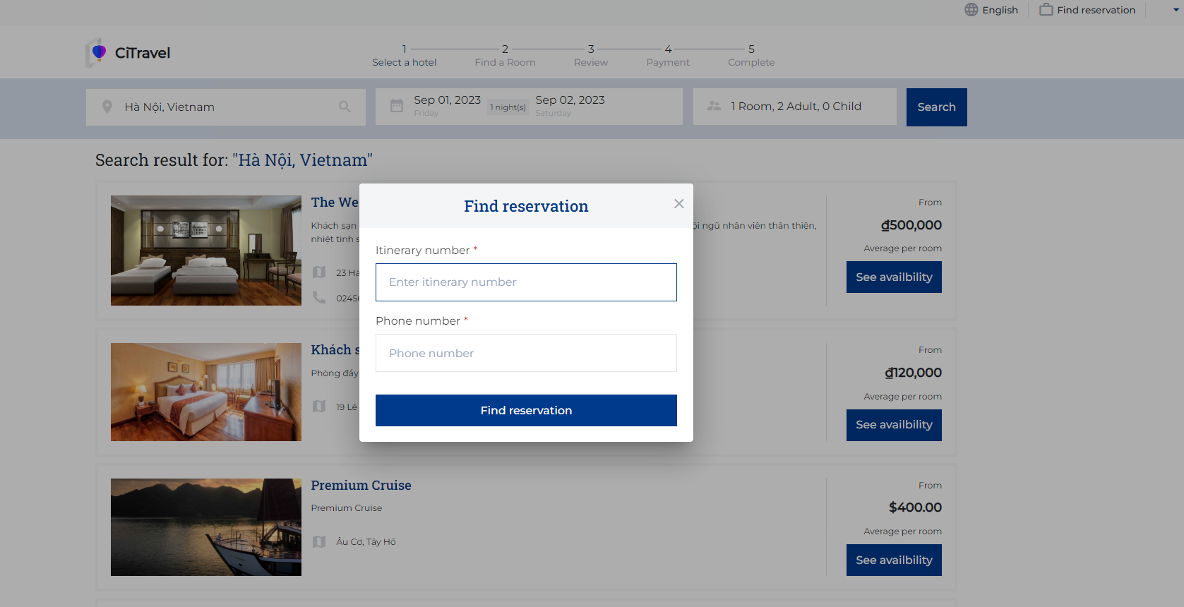 Step 5. Complete: After completing the booking, the system will send a confirmation email that includes the following information ![]() III. Find reservation![]() On the homepage screen, select 'Find Reservation' to search for the bookings that the user has made ![]() Enter the Itinerary number and Phone number to find reservation ![]() |