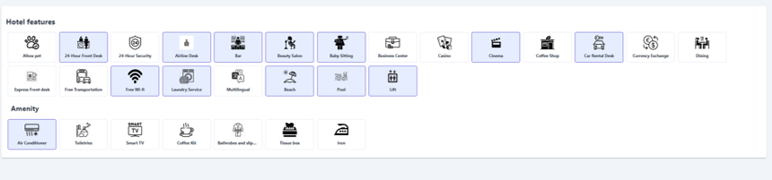 Users can check the icons representing the features/services that the hotel provides. ![]() In addition to the default amenities configured on the system, users can request the admin to add more amenities if needed. |