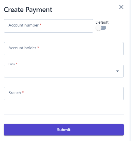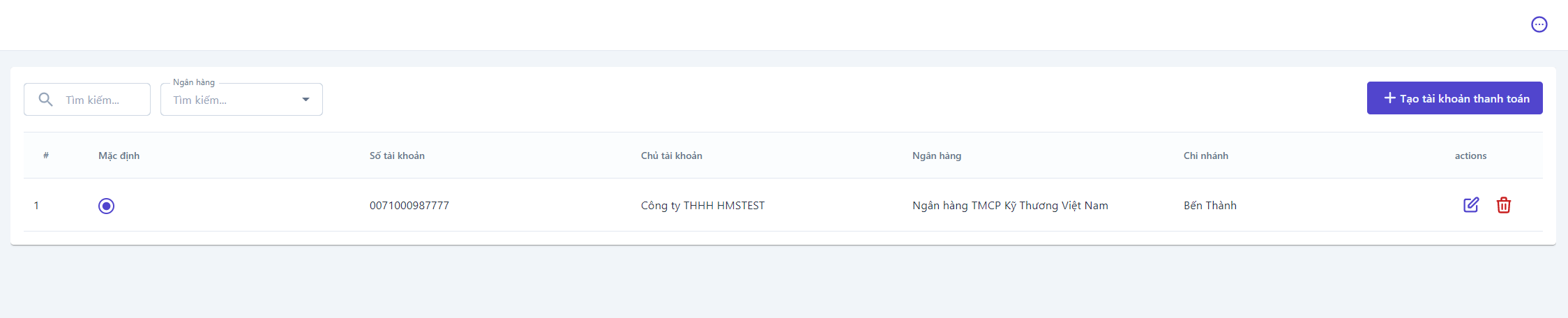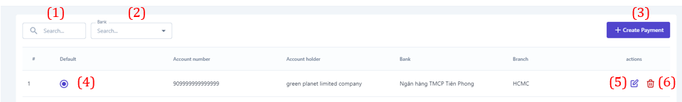 ![]() (1) Search: Enter the payment account search by information such as account number, account name. (2) Filter by bank: Filter by the bank to search for payment accounts. (3) Create Payment ![]()