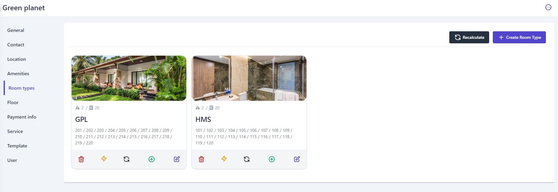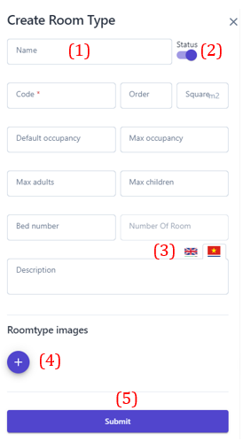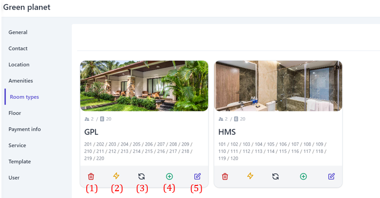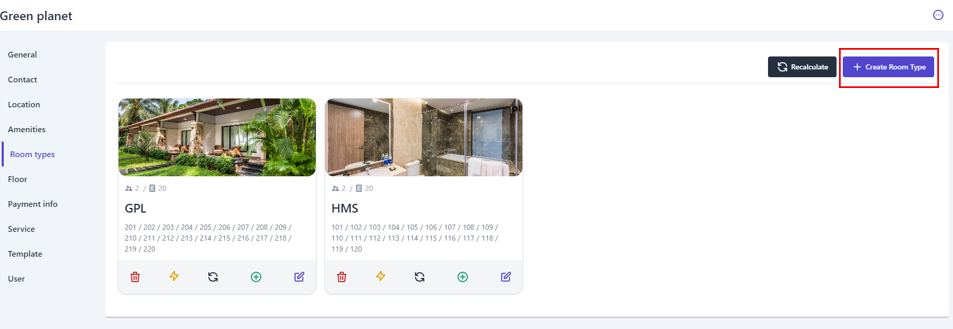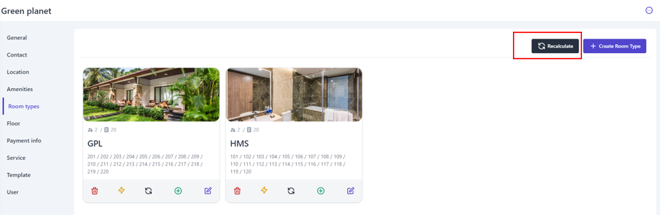 (2) Turn on/off the status bar to enable/disable selling this room category. (3) The description section can be entered in Vietnamese and English. (4) Select the icon :tạo_mới: to upload an image of the room type (5) Select "Save" to complete creating the new room type. 2. Recalculate: ![]() In case users make changes to the number of rooms for each room type, this feature will help users quickly recalculate the number of rooms in order. 3. Other Functions: ![]()
