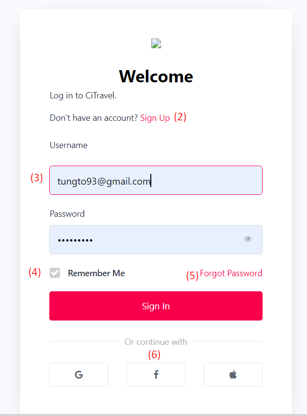 To sign in to the CiTravel system, follow these simple steps: (1) At the homepage screen, Click on the "Sign in" button ![]() ![]() (2) If users do not have an account, click on the "Sign up" button to go to the registration page. See the "Account registration" section for more details. (3) Enter your registered email address and password. (4) Click on the "Remember Me" checkbox to save your login information for future sign-ins (5) Click on the "Forgot Password" link if you forget your password and need to reset it. (6) You can also sign in using your Google, Facebook, or Apple account. |