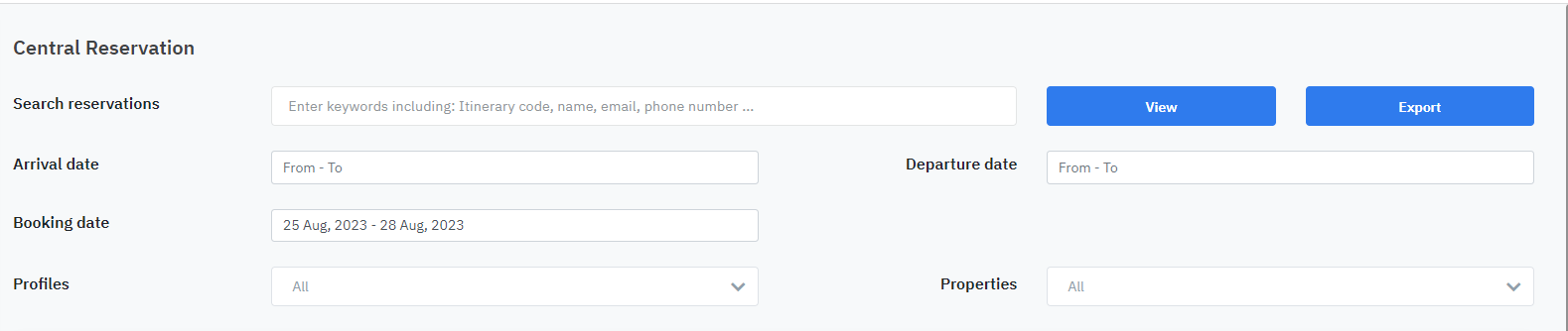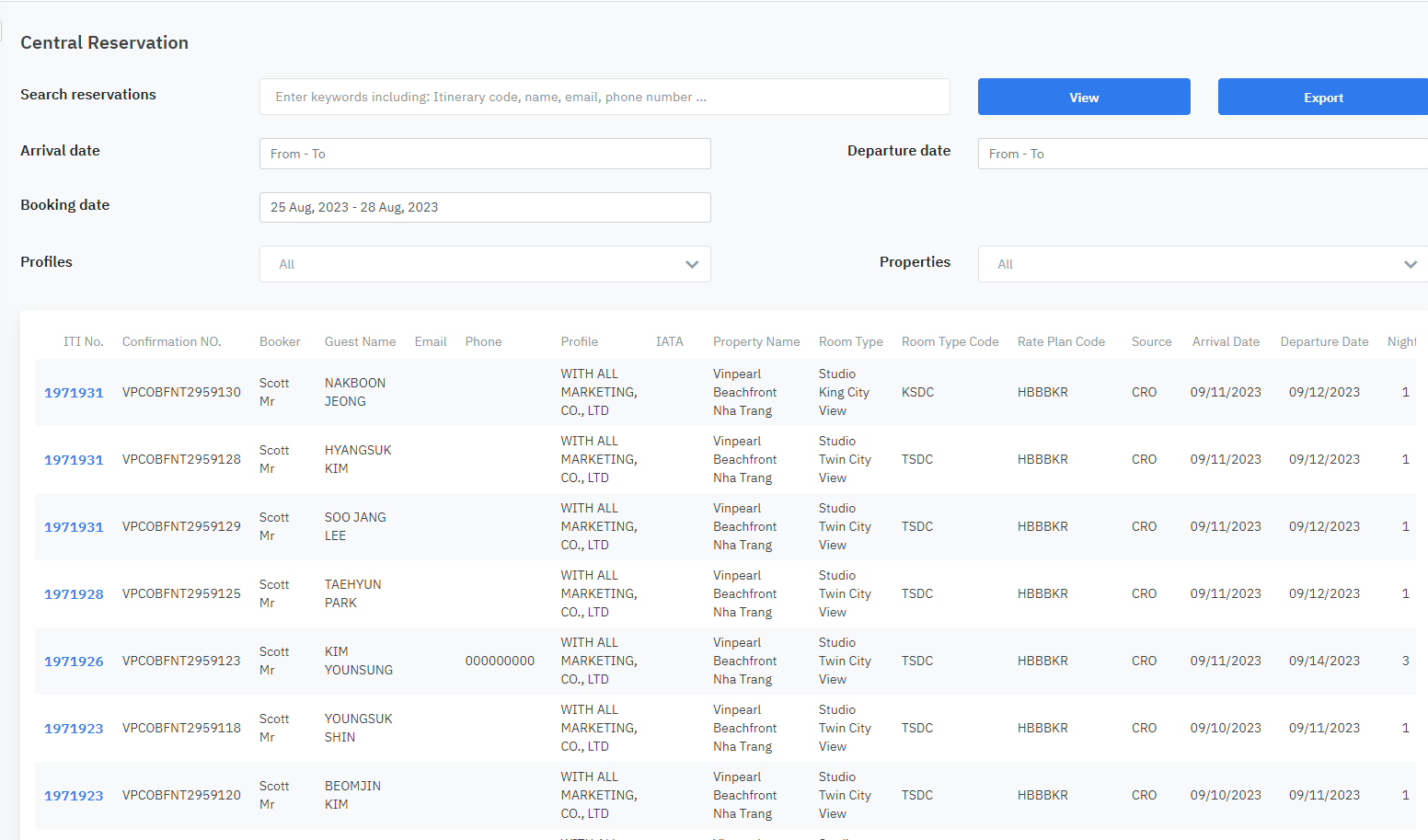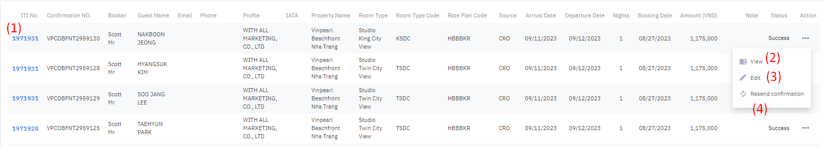 1. Filter and search:![]() (1) Search reservations: enter information such as booking code, guest name, phone number... (2) Arrival date: select the arrival date of the booking for a specific period (3) Departure date: select the departure date of the booking for a specific period (4) Booking date: select the booking date for Booking within a specific period (5) Profiles: select agent information from the available list (6) Properties: Select a facility/hotel based on the available information 2. Detailed information for each booking![]() (1): Screen displaying detailed information of the booking ![]() (2) Select View to see detailed information at (1). (3) Select Edit to modify the information. (4) Select Resend confirmation to resend the booking confirmation email. |
