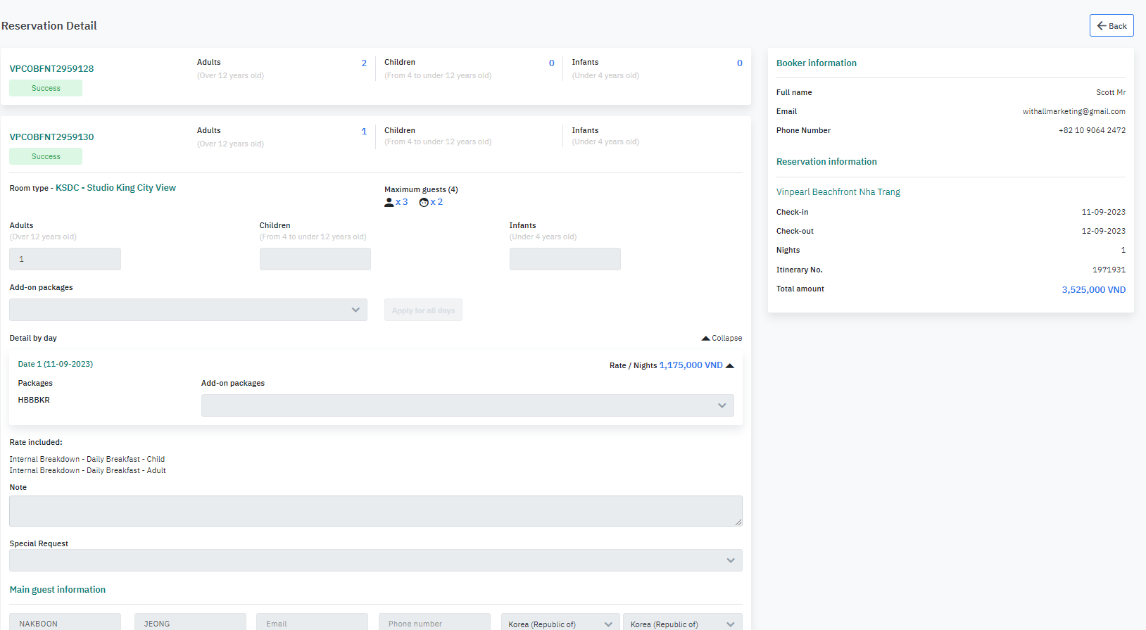 The screen displays information such as booking code, guest name, stay date... of the Agent's reservation on the Booking Portal |
