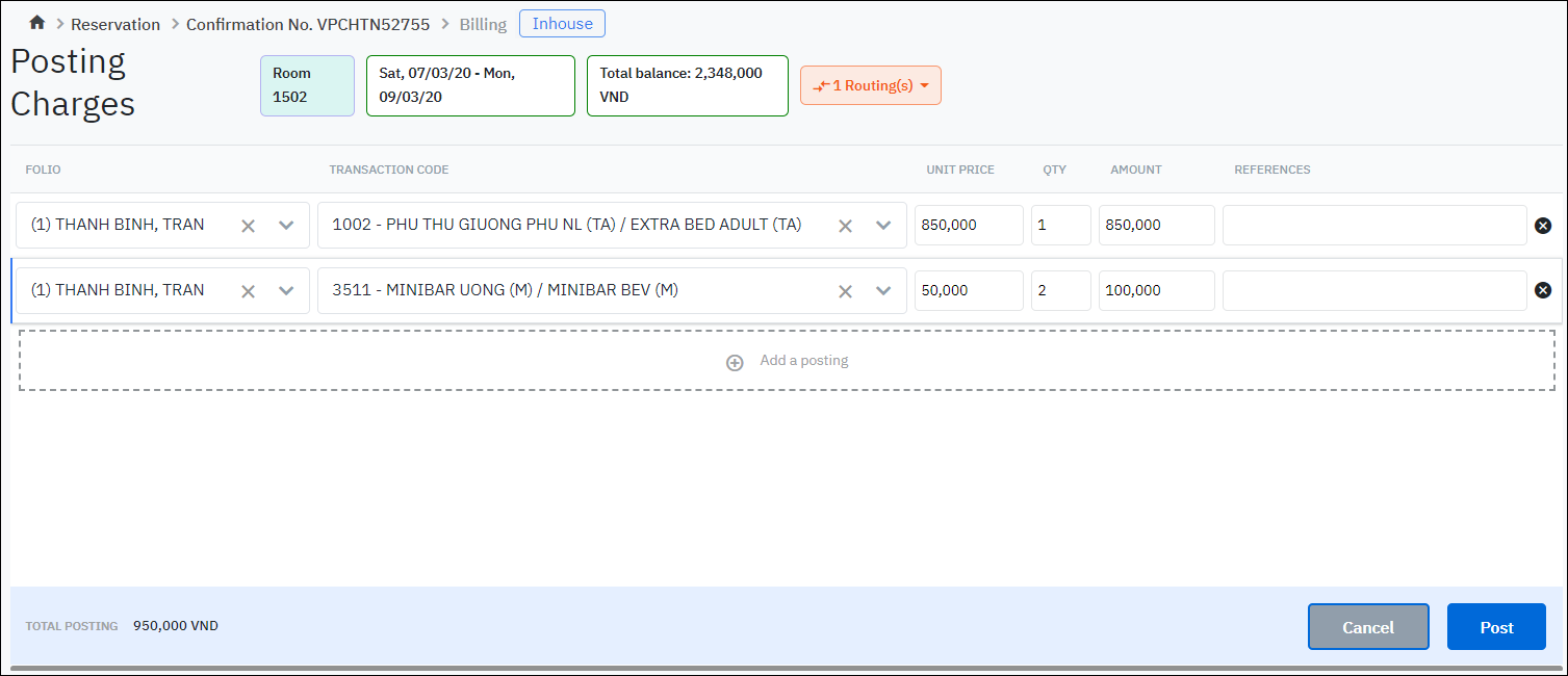 Folio: Select the folio where you want to post the charge. Transaction Code: Select the transaction code in the transactions list of values. Price: Enter the unit price of the utilized service Quantity: Enter the quantity of the utilized service Sub Amount: The system will calculate automatically the Sub Amount of the transaction (= unit price * quantity) Reference: Reference note for this posting (if any) Click on “Post“ to post the transaction. |