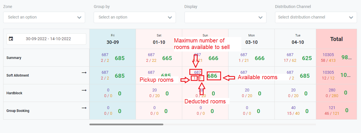 Allotment Monitor allows you to view the number of rooms on 3 levels: