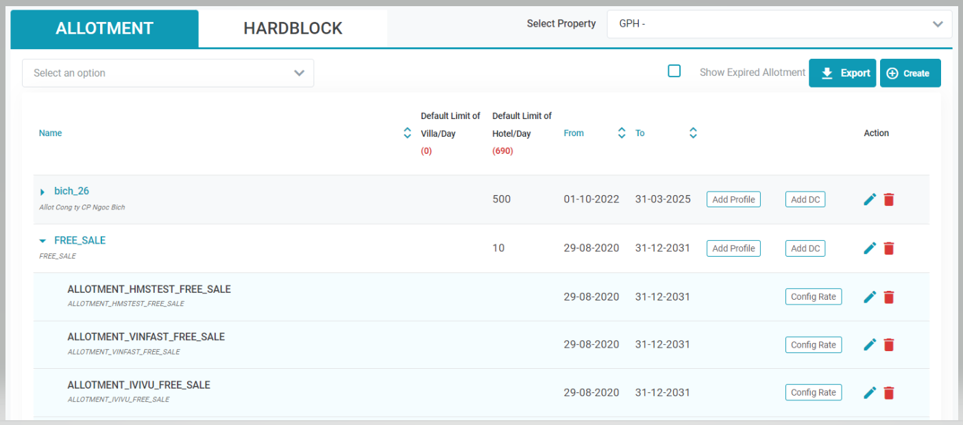 1. Create Allotment for DCIdentify the allotment that you want to create is included in which Allotment Group, add the DC for this Allotment Group. ![]() 2. Remove Allotment from DCSelect the Trash icon on the allotment row to remove it from the DC. ![]() 3. [Tab Info] - Update the allotmentSelect the Edit icon to update the details of the allotment. ![]() 3.1. Update the details info ![]()
