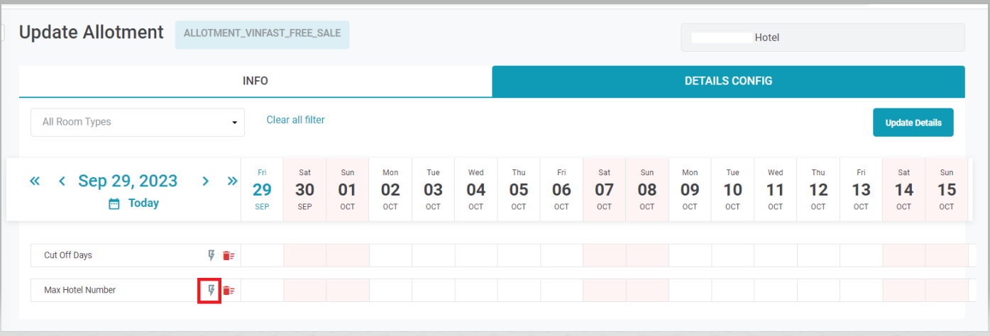 4. [Tab Details Config] - Configure the details of Allotment4.1. Configure the Cut Off Days Note: The reservations are made only when the reservation date < check in - cut off day. Select the icon Quick Update on the Cut Off Day. ![]() ![]()