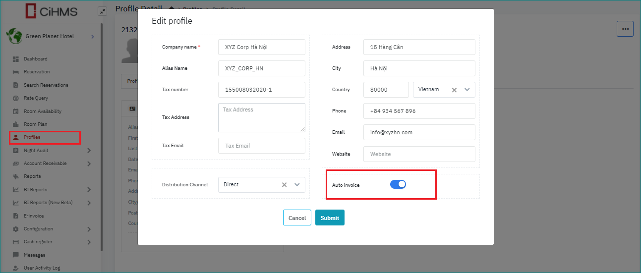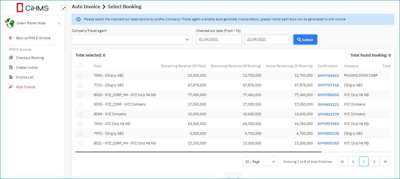 [Default conditions to create an Auto Invoice]List of folios of the checked-out reservations for the current business date that are linked with the Company/Travel Agent that are enabled the option “Auto invoice”.