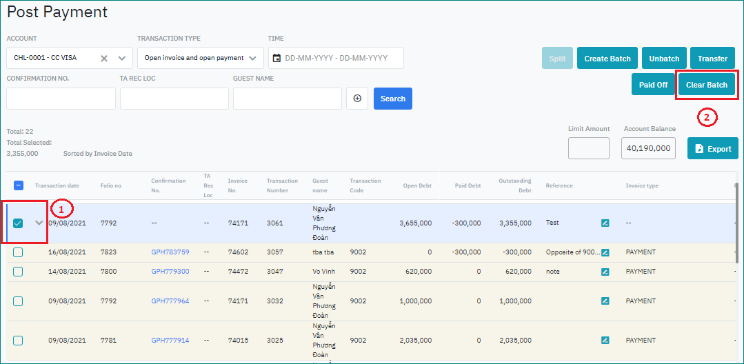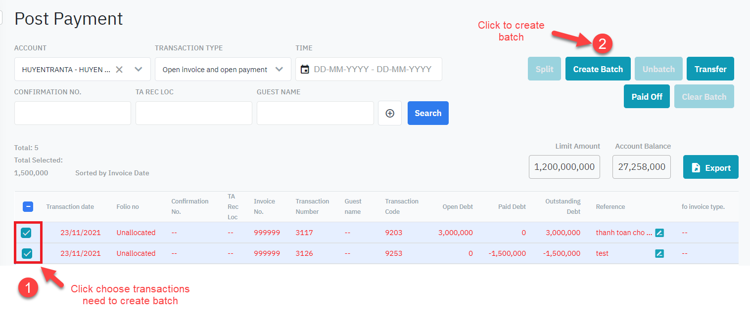 Step 1: At the screen Post Payment, search for the transaction that you want to group Step 2: Select button “Create Batch” ![]() Step 3: Enter the reference note for the transaction Step 4: Select “Submit” ![]() The system automatically creates a combined AR transactions with the total debt’s amount is the summary of the debts of all transaction that are grouped. Un batch- Ungroup the list of transactionsStep 1: At the screen Post Payment, select 1 or many transactions that are grouped in the batch Step 2: Select button “Un batch” to ungroup the selected transactions from the batch. The unbatched transactions will be displayed above and closed to the batch. ![]() Clear Batch - Remove the transactions in a batchStep 1: At the screen Post Payment, select a batch that you want to remove the transactions Step 2: Select “Clear Batch” ![]() Step 3: At the screen Clearing Batch, select the transactions that you want to remove (1), then enter the reference note if any (2). Confirm the action by clicking the button “Clear” (3). ![]() |