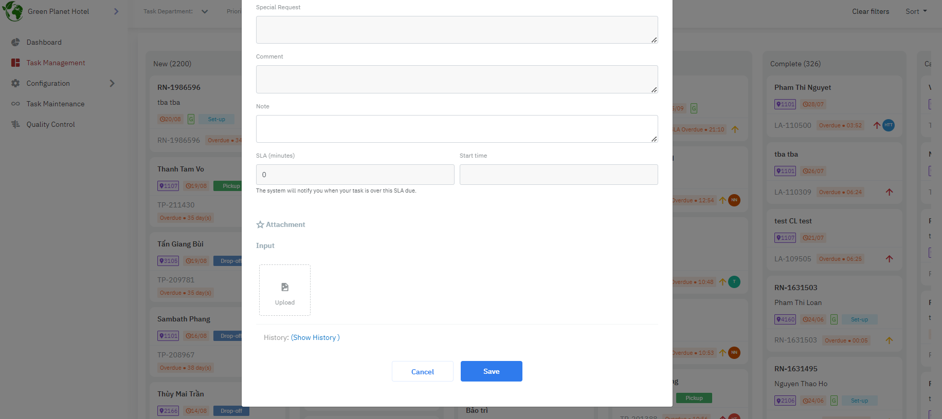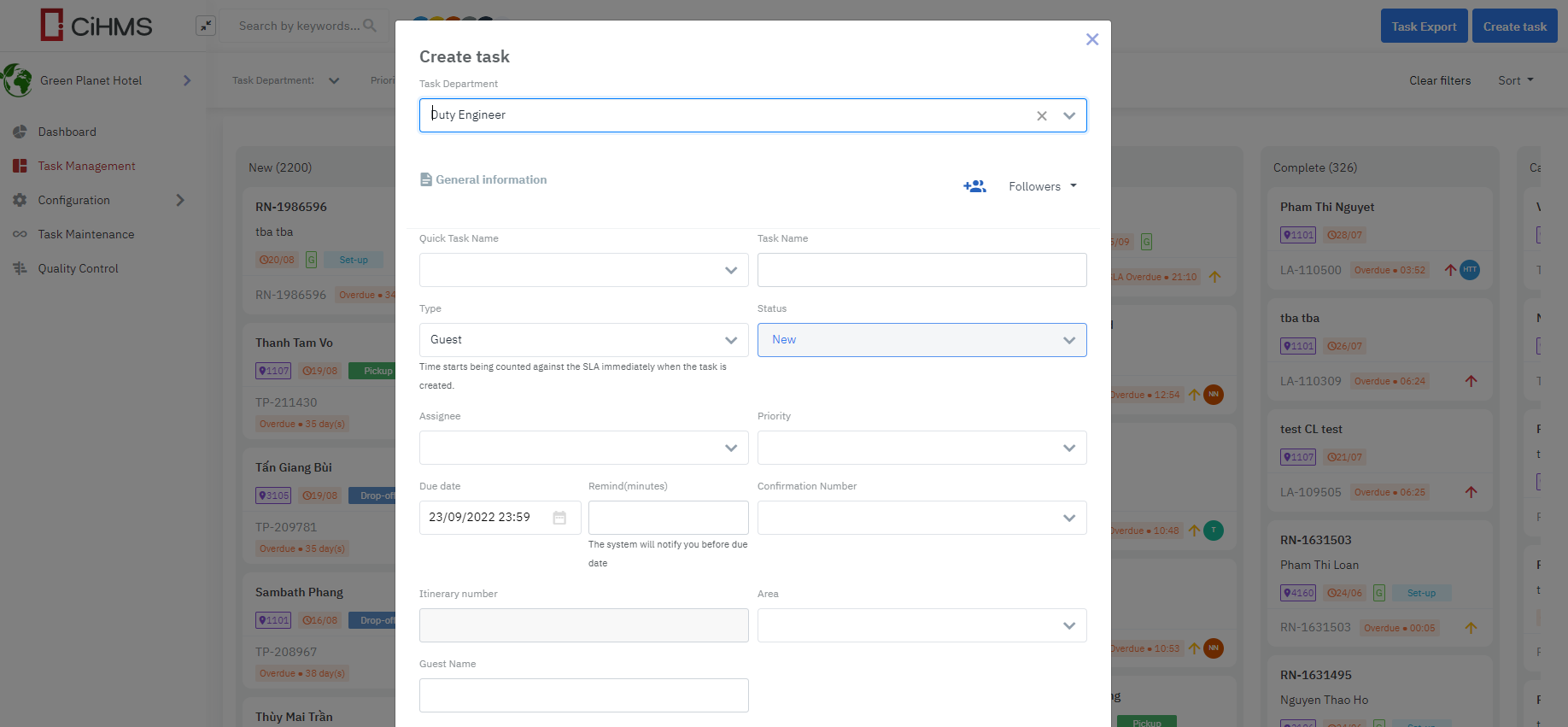 The screen allows you to create a new task for the Duty Engineer following the pre-configured template of the Engineering department. Once the task is created, the system will send the push notification to the creator, supervisor, and assignee. The notification is sent to the web as well as mobile application if this user uses the Staff App application on their mobile phone. |